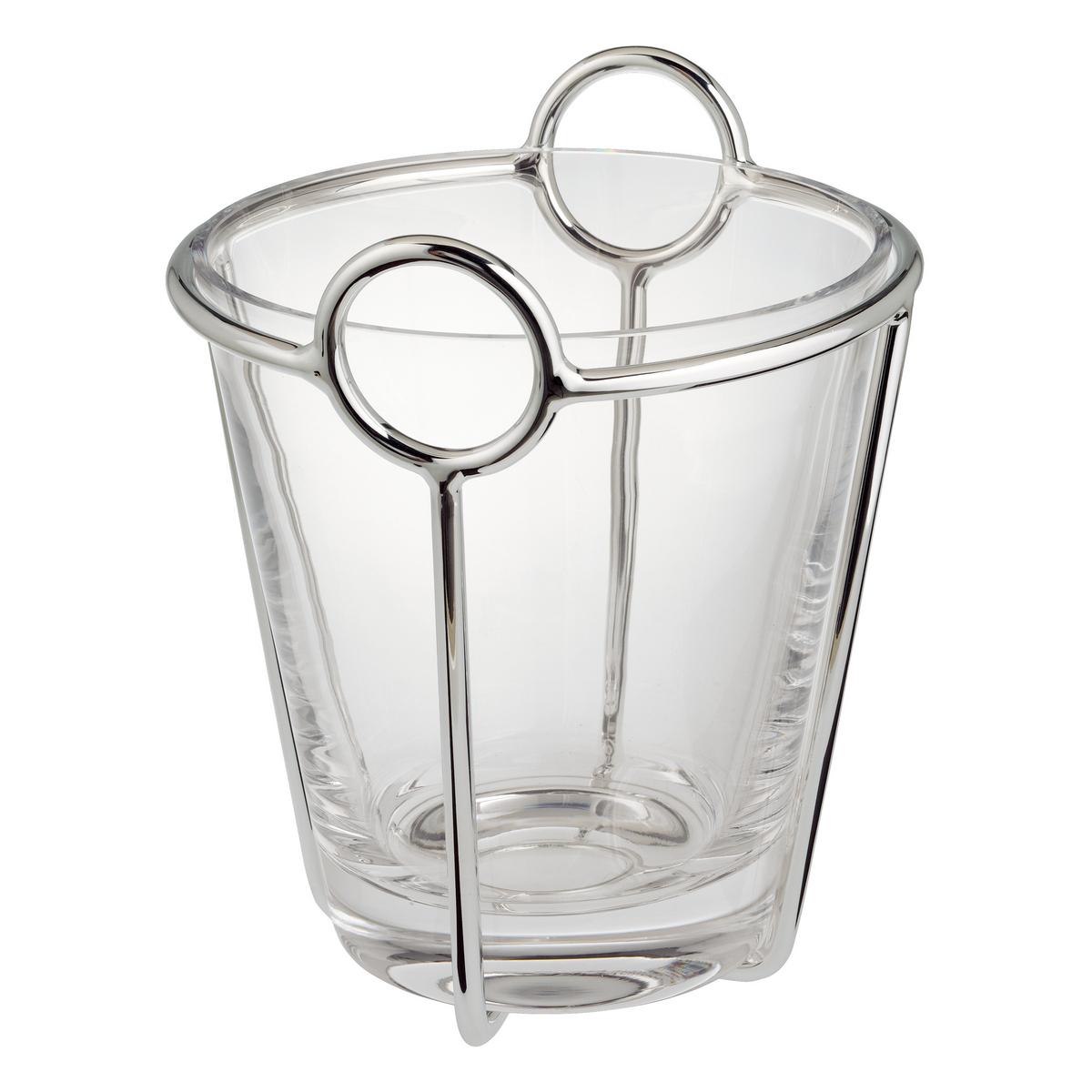 Der Champagnerkühler und Eisbehälter "Latitude" von Ercuis erinnert von seiner Form heran einen Korb mit kurzen Henkeln: Der Kristallglaseimer ist in ein versilbertes Gestell eingelassen, dass an zwei Seiten große, runde Ringe hat. Nicht nur optisch sind diese hochglänzenden Ringe "ergreifend". Sie dienen auch ganz pragmatisch, zum besseren Transportieren des Champagnerkühlers oder Eisbehälters "Latitude" von Ercuis.
