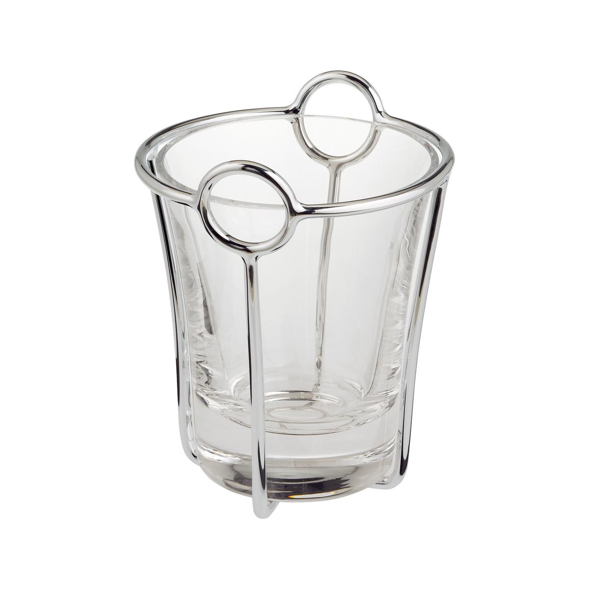Der Champagnerkühler und Eisbehälter "Latitude" von Ercuis erinnert von seiner Form heran einen Korb mit kurzen Henkeln: Der Kristallglaseimer ist in ein versilbertes Gestell eingelassen, dass an zwei Seiten große, runde Ringe hat. Nicht nur optisch sind diese hochglänzenden Ringe "ergreifend". Sie dienen auch ganz pragmatisch, zum besseren Transportieren des Champagnerkühlers oder Eisbehälters "Latitude" von Ercuis.