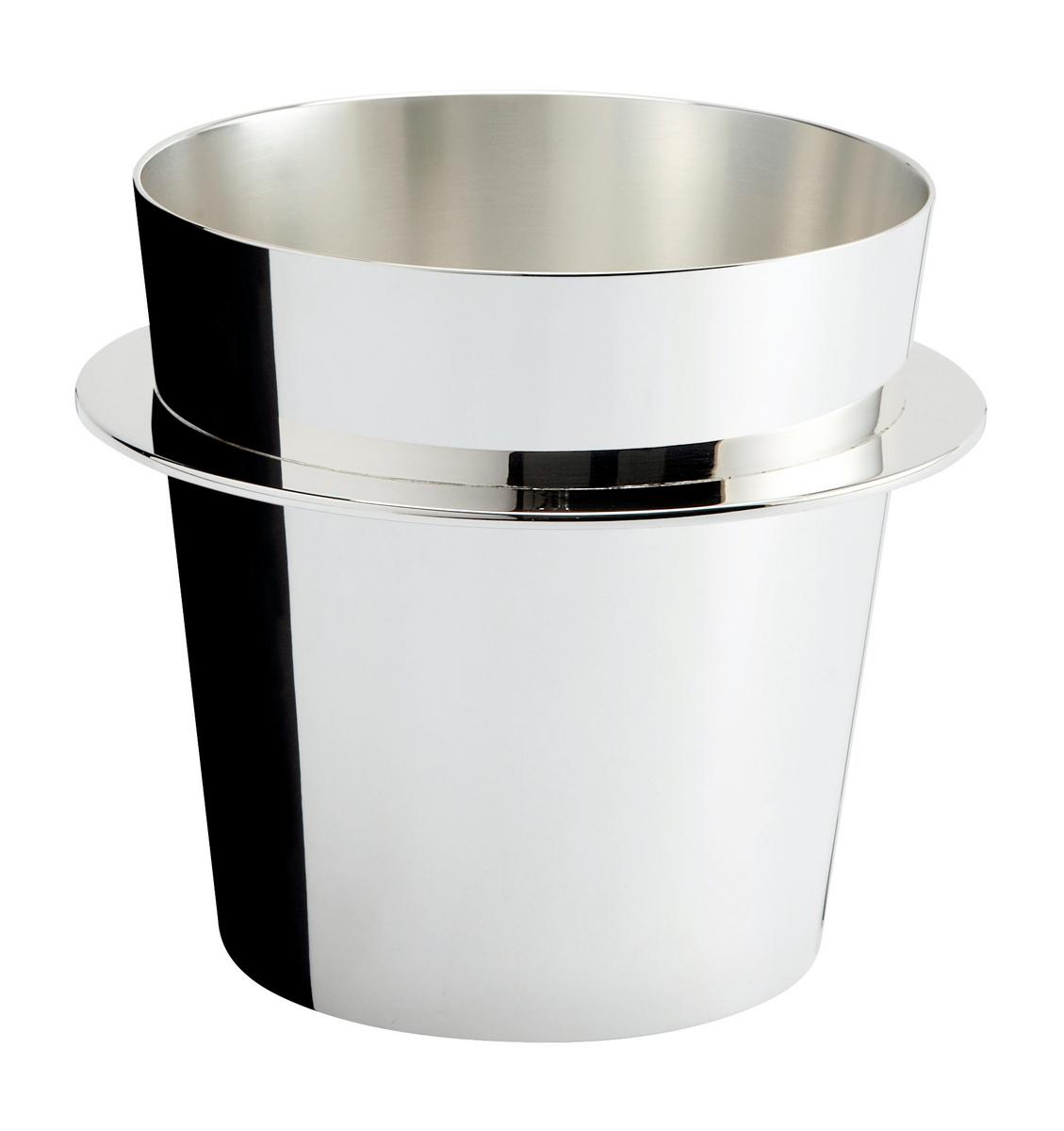 Neue Linie von Ercuis im zeitlos-klassischen Design: Die umlaufende Borte, die auch als Griff dient, ist dem Ring nachempfunden, der den Saturn umgibt. Zu dem versilberten Ensemble gehören Champagnerkühler und Eisbehälter. Der Eisbehälter "Saturn" von Ercuis macht auch als Vase eine gute Figur.