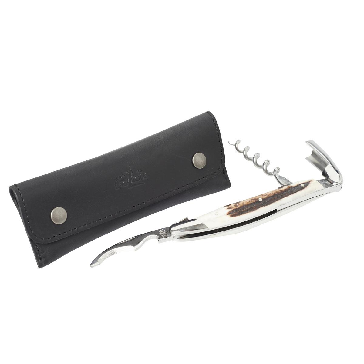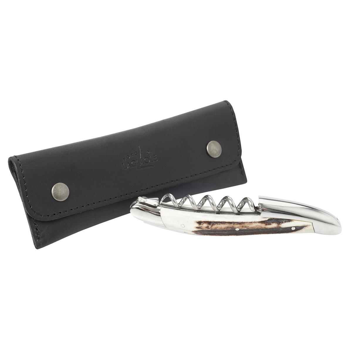 Das Sommeliermesser "Hirschhorn" von Forge de Laguiole wird in einem schwarzen Lederetui geliefert und eignet sich auch wunderbar als Geschenk für Weinliebhaber.
