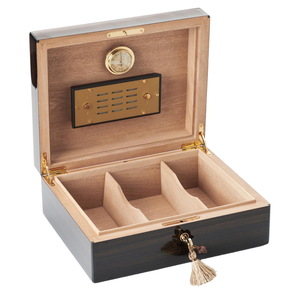 • Innen: Zedernholz, außen: Makassar-Ebenholz, Verschluss aus Messing (nur für die Humidore 75 und 110 Zigarren)