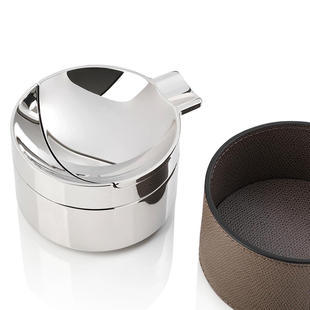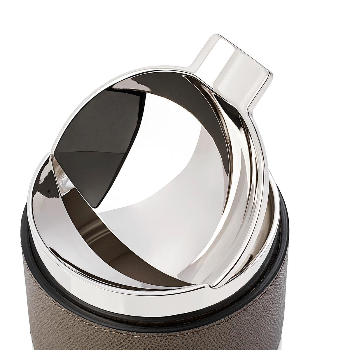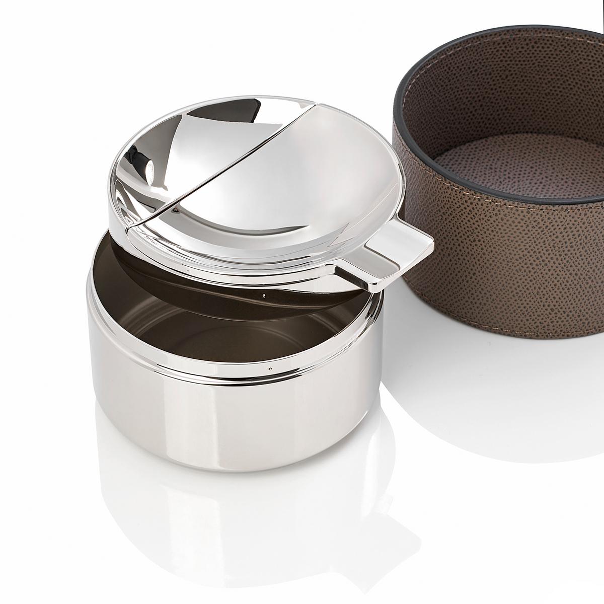 Der mit Kalbsleder ummantelte Aschenbecher "Colorado" von GioBagnara ist nicht nur edel und schlicht sondern auch funktional. Ein kippbarer Deckel sorgt dafür, dass Zigaretten und Asche in eine abgetrennte Kammer fallen. Diese kann bei Bedarf herausgenommen und entleert werden.