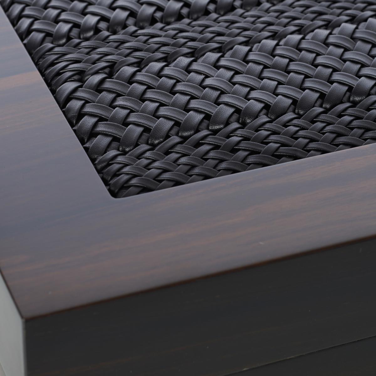 Der Humidor "Woven" von Riviere ist aus wertvollem Makassar-Ebenholz gefertigt, das für seine auffällige Maserung bekannt ist. Eine Einlage aus handgeflochtenem schwarzen Nappaleder ziert den wertvollen Humidor am Deckel.