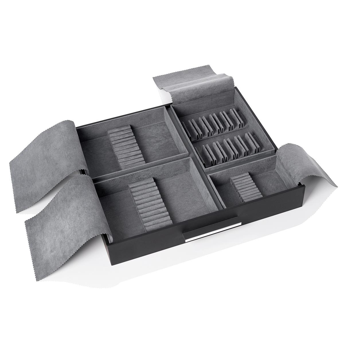 Diese Besteckkassette hat 3 Schubladen mit 11 Modulen. Sie ist für ein 132-teiliges Besteckset von Christofle ausgelegt. Sie kann maximal 132 Einzelteile (mit Besteckstützen) oder 120 Teile + 1 großes Modul für Servierstücke (ohne Besteckstützen) aufnehmen.