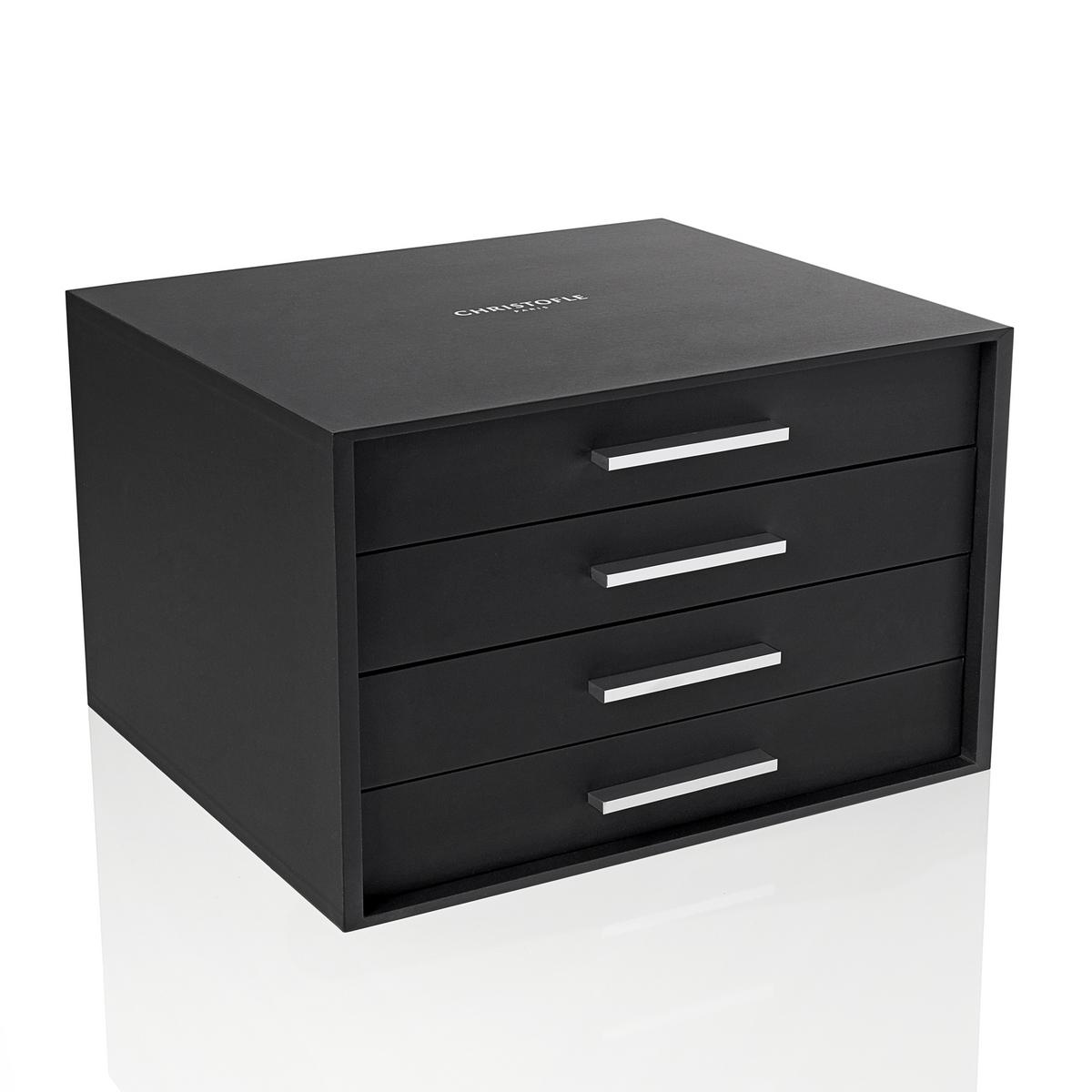 Diese Besteckkassette hat 4 Schubladen mit 14 Modulen. Sie ist für ein 168-teiliges Besteckset von Christofle ausgelegt. Sie kann maximal 168 Einzelteile (mit Besteckstützen) oder 156 Teile + 1 großes Modul für Servierstücke (ohne Besteckstützen) aufnehmen.