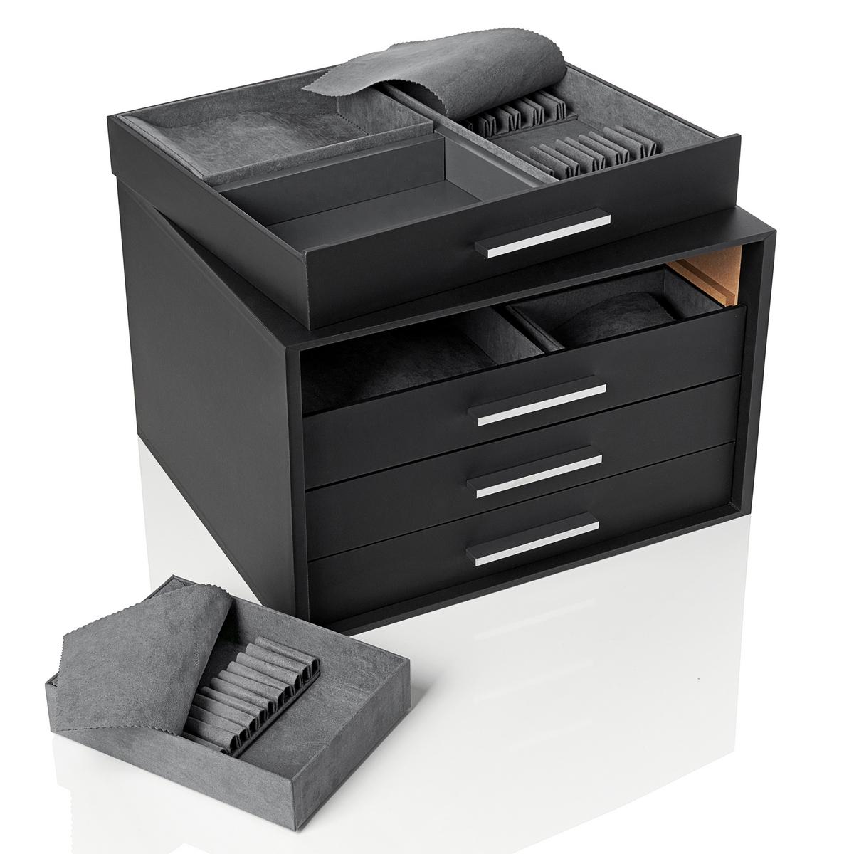 Die matt schwarze Besteckkassette besitzt unterschiedliche Module, die jeweils einzeln herausnehmbar sind . Wiederum jedes einzelne Modul hat herausnehmbare Besteckhalterungen. So können Sie jedes Modul Ihrem persönlichen Bedarf anpassen oder auch einzelne Module in der Küche oder in anderen Möbelstücken aufbewahren (Modulhöhe 4,8 cm).