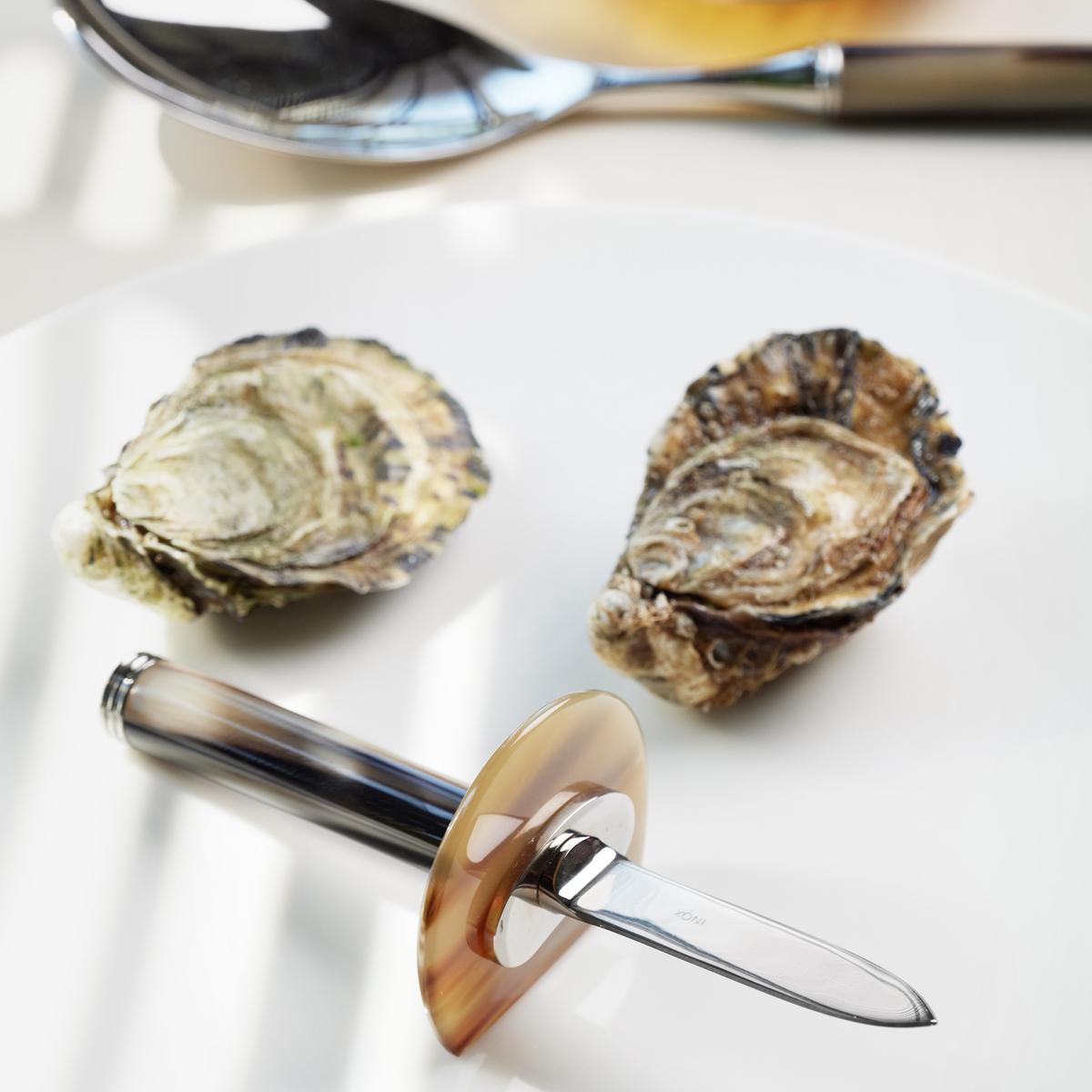 Frische Austern sind eine feine Gaumenfreude, doch um sie genießen zu können, ist viel Handarbeit und Geschick gefragt. Das Besteck für Austern "Belon" von Arcahorn bietet für Köche und Gourmets einen sicheren Schutz beim Öffnen der köstlichen Meeres-Delikatesse. Das elegante Austernmesser verbindet die Raffinesse von Naturhorn mit der Widerstandsfähigkeit von Edelstahl.