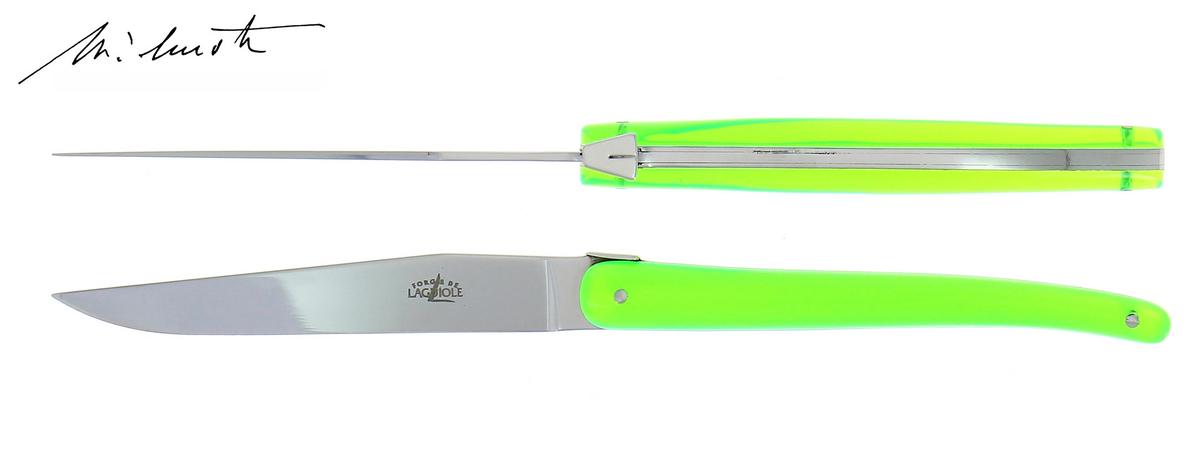 Jean-Michel Wilmotte entwarf für Forge de Laguiole exklusive Steakmesser in fluoreszierenden Farben. Dafür bekam der französische Architekt und Stardesigner jede Menge Lob. Gefertigt werden die fluoreszierenden Steakmesser in den Ateliers von Forge de Laguiole. Ganz nach Tradition des Hauses ist dort, wie vor 175 Jahren, für die Fertigstellung eines Messers jeweils nur ein Messermacher zuständig. Einzigartig ist auch die unvergleichlich flexible, nicht rostende und dabei ganz einfach zu schärfende Klinge, die erst geschmiedet und dann mit dem Klingenstahl T12 gehärtet wird.