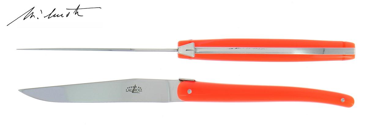 Jean-Michel Wilmotte entwarf für Forge de Laguiole exklusive Steakmesser in fluoreszierenden Farben. Dafür bekam der französische Architekt und Stardesigner jede Menge Lob. Gefertigt werden die fluoreszierenden Steakmesser in den Ateliers von Forge de Laguiole. Ganz nach Tradition des Hauses ist dort, wie vor 175 Jahren, für die Fertigstellung eines Messers jeweils nur ein Messermacher zuständig. Einzigartig ist auch die unvergleichlich flexible, nicht rostende und dabei ganz einfach zu schärfende Klinge, die erst geschmiedet und dann mit dem Klingenstahl T12 gehärtet wird.
