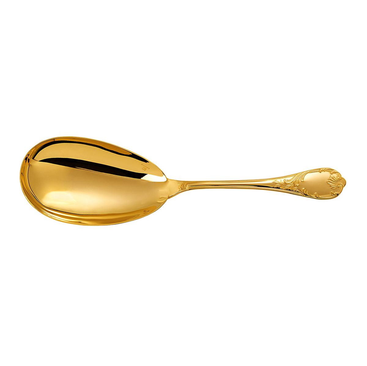 Dem Rocaille-Stil treu gehört "Marly" zu den am reichsten verzierten Besteckmodellen von Christofle. Einladende Kurven liegen bequem in der Hand; grazile Akanthus-Blätter umranken dynamisch Stiele und Griffe. Asymmetrische Muschelmotive setzen Akzente und geben dem Besteck seinen französischen Charakter. Löffel und Gabeln sind für das traditionelle Eindecken "à la française" mit dem Rücken nach oben gestaltet. Dank der darunterliegenden Versilberung ist die Vergoldung besonders robust und sieht atemberaubend gut aus. Nur die Edelstahlschneiden der Messer bleiben blank.