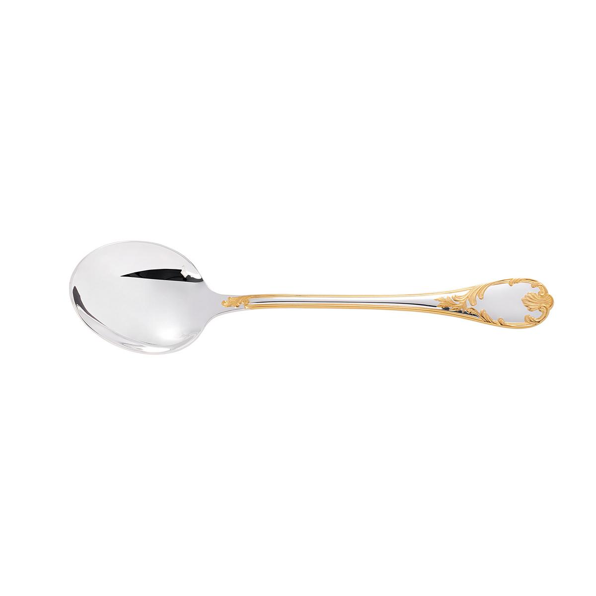 Dem Rocaille-Stil treu gehört "Marly" zu den am reichsten verzierten Besteckmodellen von Christofle. Einladende Kurven liegen bequem in der Hand; grazile Akanthus-Blätter umranken dynamisch Stiele und Griffe. Asymmetrische Muschelmotive setzen Akzente und geben dem Besteck seinen französischen Charakter. Löffel und Gabeln sind für das traditionelle Eindecken "à la française" mit dem Rücken nach oben gestaltet. Die präzise Reliefvergoldung rückt die Dynamik und den Detailreichtum der Ornamente in den Vordergrund.