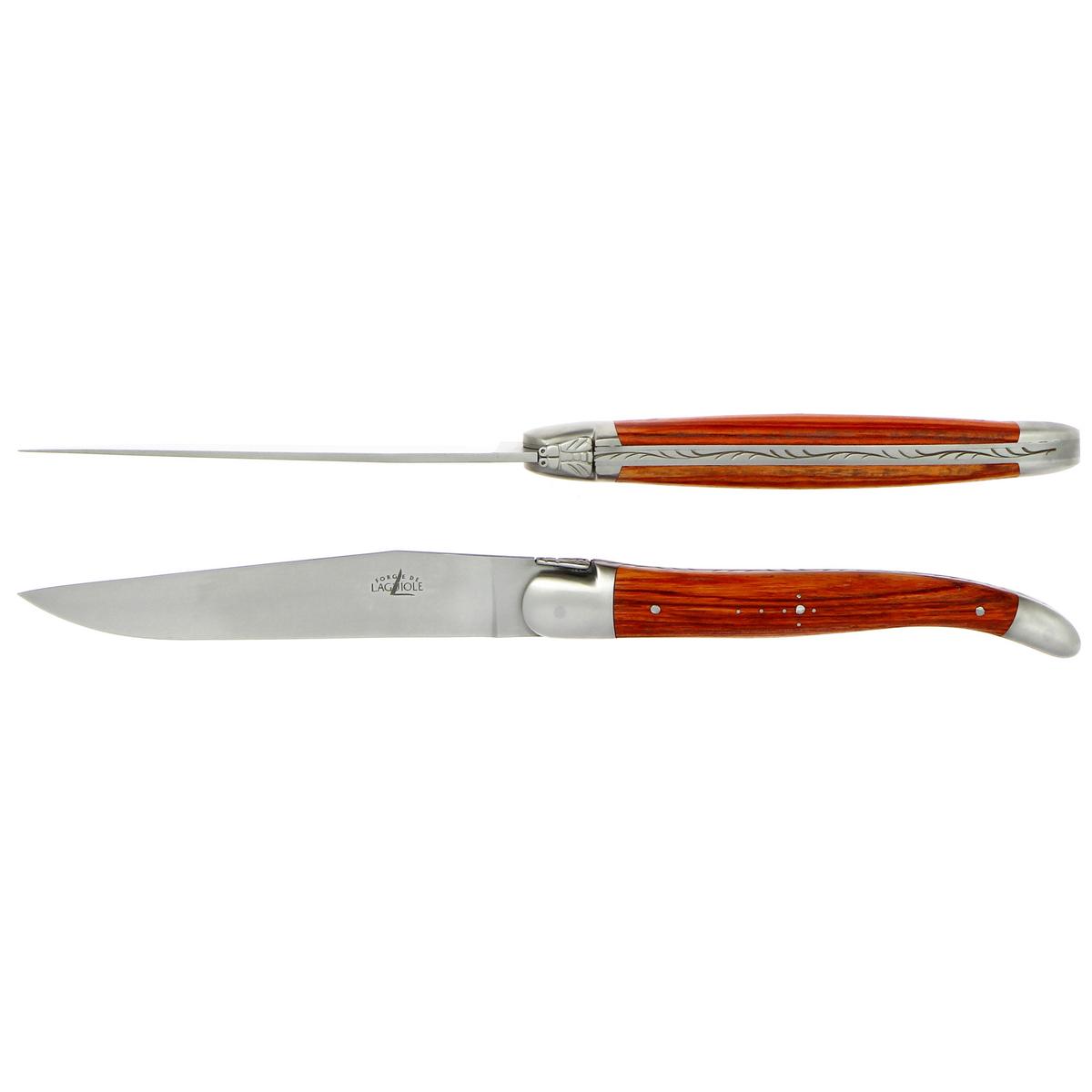 Forge de Laguiole kombiniert wahlweise Olivenholz, Erika (Bruyere), Wacholder, Amourette, Rosenholz, Ebenholz und Thuja mit besonders glatten Klingen aus dem Spezialstahl T12. Die Edelholzgriffe gewinnen durch Beschläge aus satiniertem, mattem Edelstahl eine sehr harmonische Optik.
