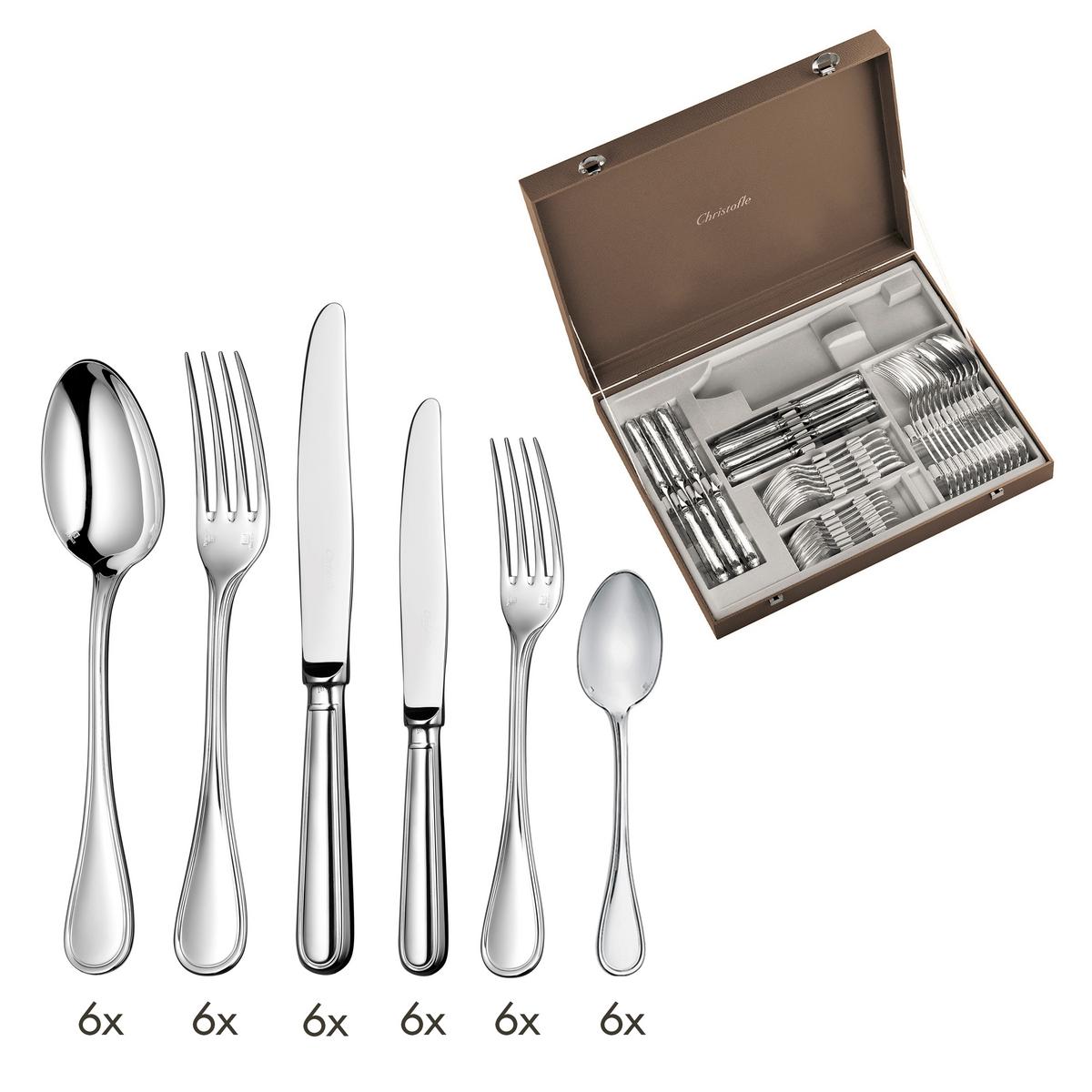 "Albi" versilbert, 36-tlg. mit Etui: je 6 x Tafellöffel, -gabel, -messer, Dessertgabel, -messer und Kaffeelöffel von Christofle