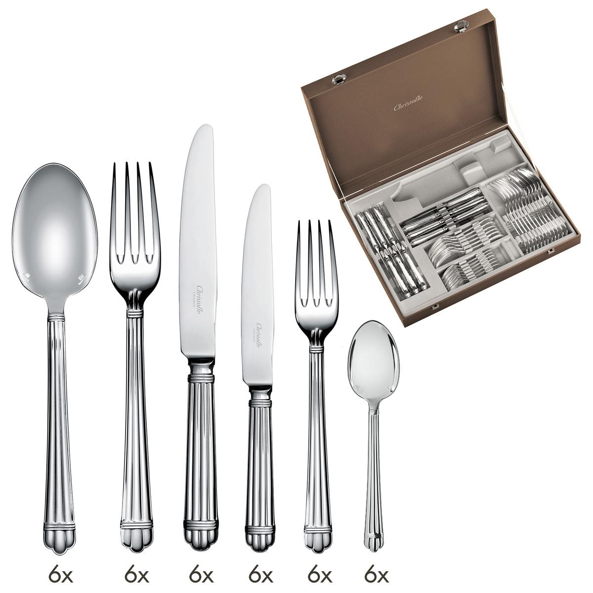 "Aria" versilbert, 36-tlg. mit Etui: je 6 x Tafellöffel, -gabel, -messer, Dessertgabel, -messer und Kaffeelöffel von Christofle