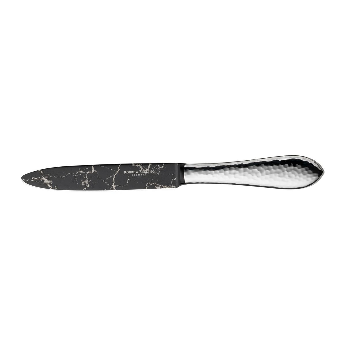 Die neuen Menümesser "Martelé" von Robbe & Berking haben eine anthrazit-schwarze Beschichtung aus der Materialklasse der diamantähnlichen Kohlenstoffe (Diamond - like Carbon DLC), die den Robbe & Berking Messerklingen einen sehr edlen-technischen Look in mattem Schwarz verleiht.