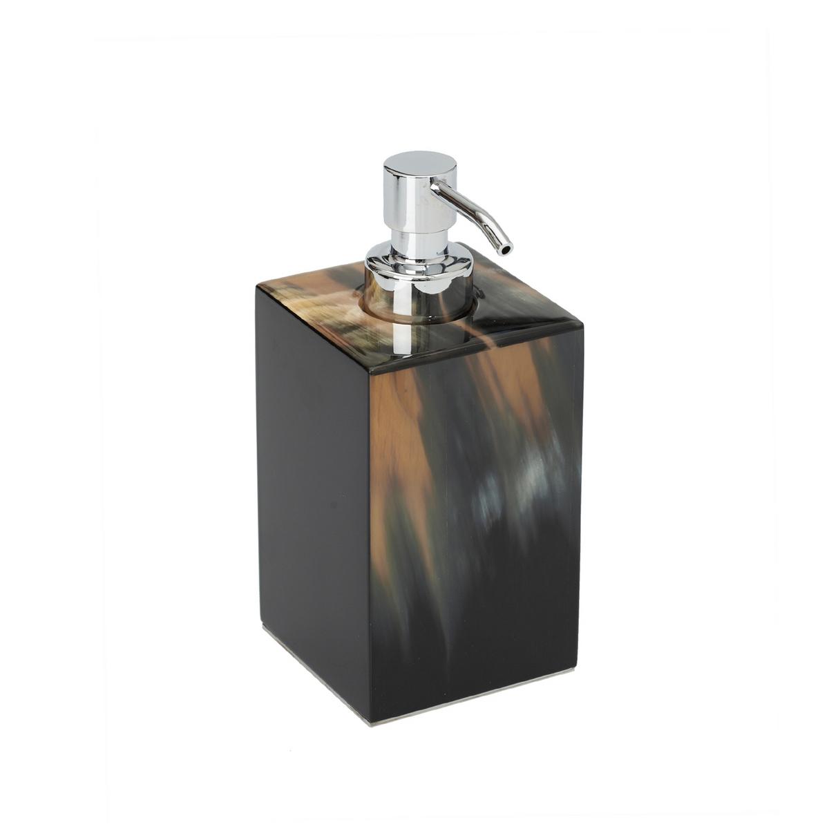 • Ein Seifenspender und ein Zahnbürstenhalter aus dunklem Büffelhorn und verchromtem Messing, mit schwarzer Lackierung.