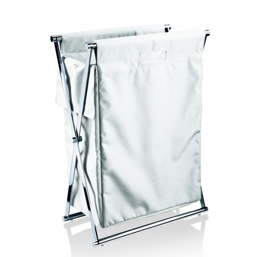Der Wäschebehälter "Cross" von Decor Walther ist ein vornehmer Lückenfüller: Mit seinen schmalen Proportionen, passt er hervorragend hinter Türen oder in Nischen — macht dort aber mit dem glänzenden, verchromten Klappgestell ordentlich etwas her.