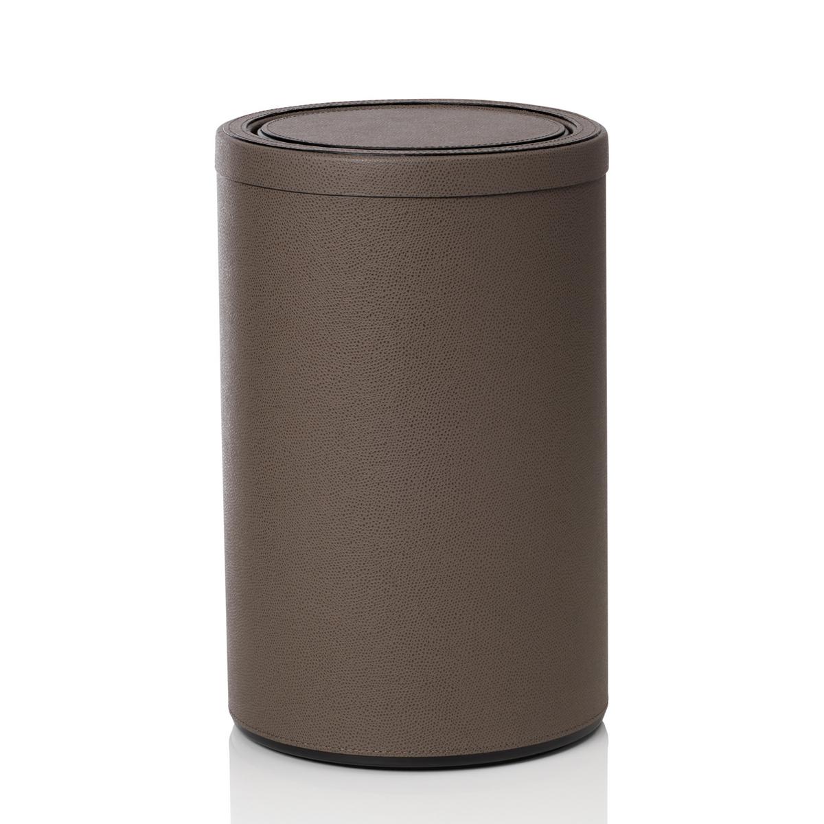Das feine Lederoutfit macht die Leder-Papierkörbe "Swing" von GioBagnara zu einem eleganten Deko-Accessoire. Die Lederoberfläche ist wasserabweisend und lässt sich mit einem weichen Tuch und milder Seife leicht reinigen. Die Unterseite besteht aus einem rutschfesten, wasserdichten Gummiboden. Ein abnehmbarer Kippdeckel sorgt für eine einfache Reinigung. Der Kunststoffeinsatz ist nicht herausnehmbar.