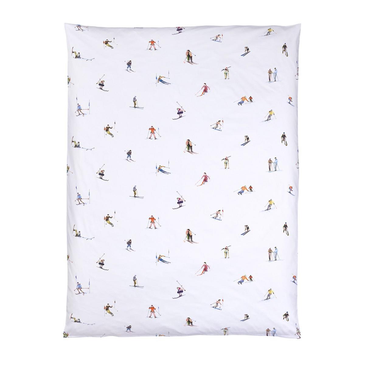 Die Bettwäsche "Engadina" von Christian Fischbacher greift mit seinen Skifahrer Motiven ein typisches Schweizer Thema auf. Auf der Bettwäsche tummeln sich Wintersportler aus den 1920er und 1930er Jahren gepaart mit Skifahrern aus der heutigen Zeit – mal im Abfahrtslauf, mal am Pistenrand plauschend. Die detailreichen Entwürfe entführen ihren Betrachter auf die Pisten von St. Moritz, dem Geburtsort des alpinen Wintersports im Zentrum des Engadin. Die Motive der Bettwäsche "Engadina" bestehen aus einer Mischtechnik von Aquarell und Fotografie. Die Skifahrer werden per aufwendigen 12-Schablonendruck auf den federleichten Baumwollsatin von Christian Fischbacher aufgebracht.
