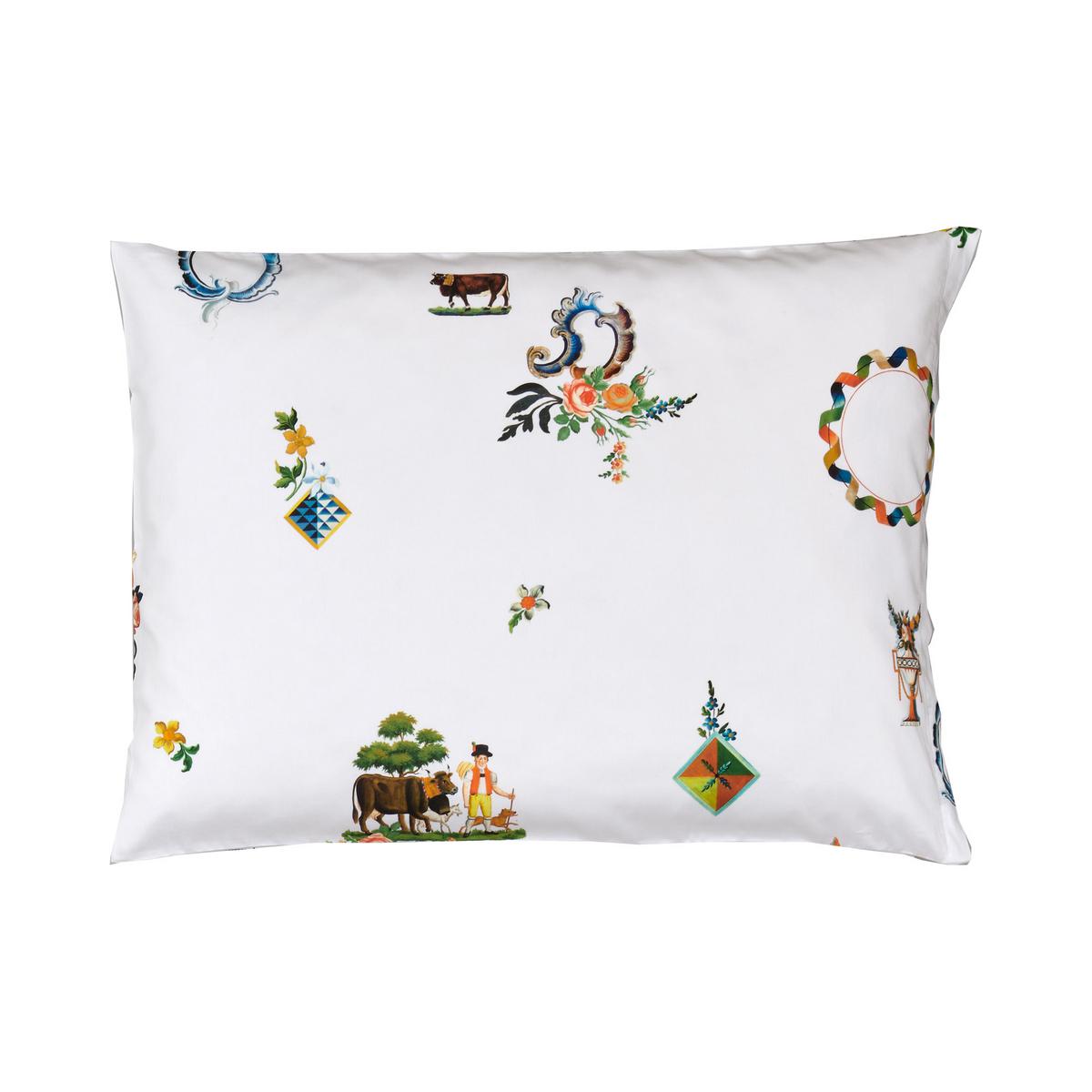 Die Bettwäsche "Säntis" von Christian Fischbacher bringt schweizerische Traditionen mit spielerischer Leichtigkeit auf eine delikate Satinbettwäsche. Die Motive aus alten Bauernmalereien wirken durch viel Weissraum schwerelos und lebendig, romantisch und zugleich überraschend modern. Für diese charmante Bettwäsche hat sich das Fischbacher Design-Team im Archiv des Appenzeller Brauchtumsmuseums in Urnäsch umgesehen, ausgewählte Malereien digitalisiert und neu arrangiert.
