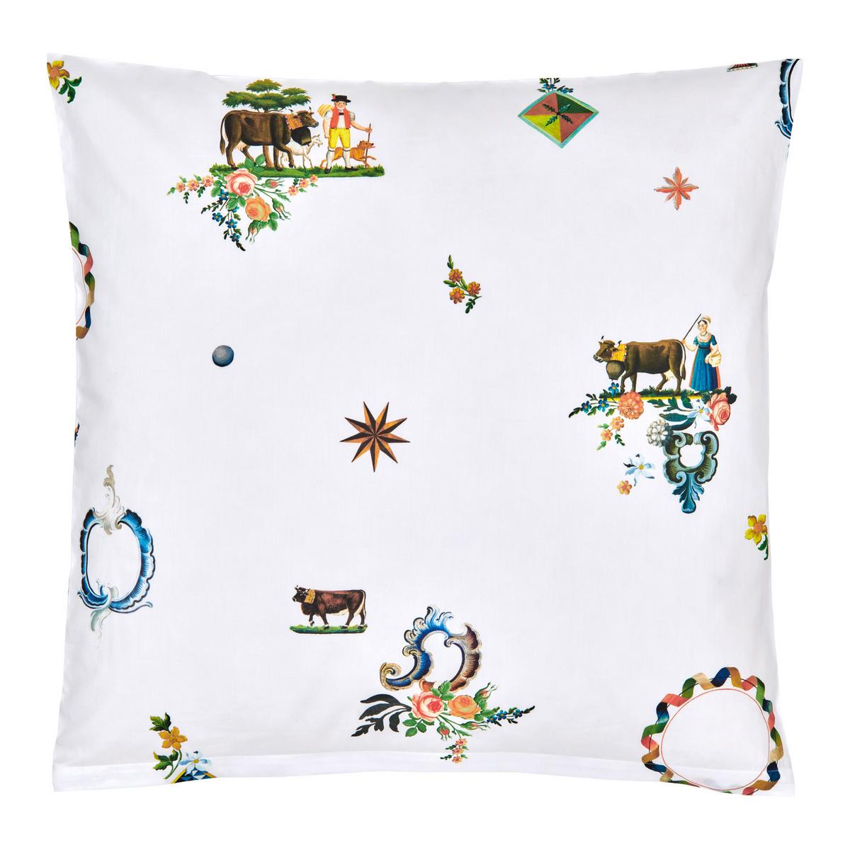 Die Bettwäsche "Säntis" von Christian Fischbacher bringt schweizerische Traditionen mit spielerischer Leichtigkeit auf eine delikate Satinbettwäsche. Die Motive aus alten Bauernmalereien wirken durch viel Weissraum schwerelos und lebendig, romantisch und zugleich überraschend modern. Für diese charmante Bettwäsche hat sich das Fischbacher Design-Team im Archiv des Appenzeller Brauchtumsmuseums in Urnäsch umgesehen, ausgewählte Malereien digitalisiert und neu arrangiert.
