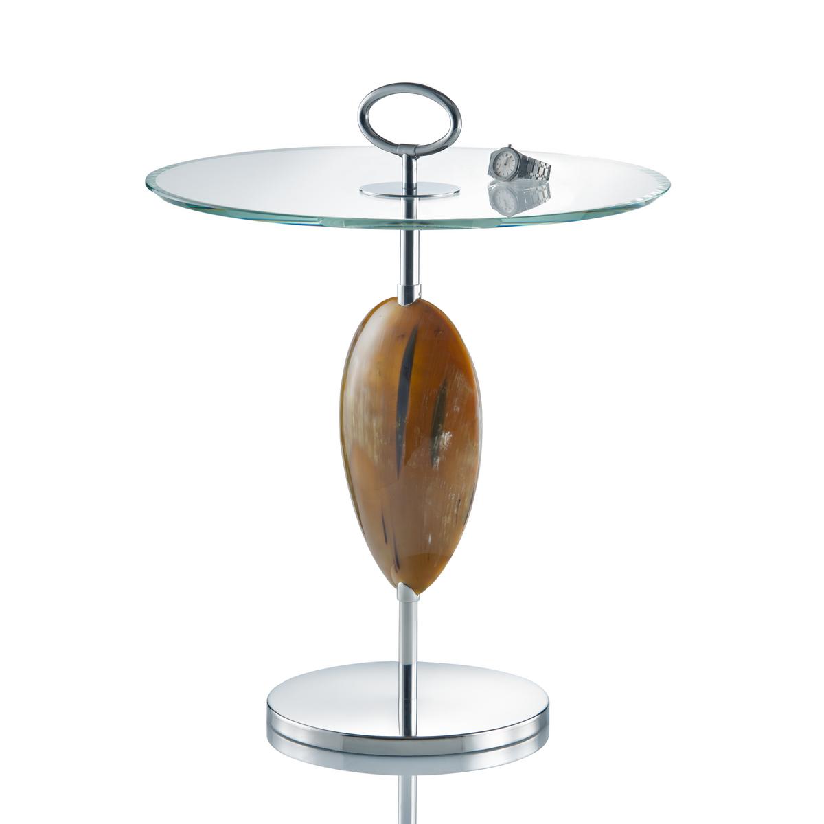 Im Fuß des Beistelltisches "Macari" ist, in der Form eines großen Tropfens, feinstes Büffelhorn verarbeitet. Vor der Verarbeitung wird das Büffelhorn eingeschmolzen. Während dieses Vorgangs entsteht die individuelle, natürliche Maserung, die jedes Arcahorn Hornprodukt zu einem Unikat werden lässt.