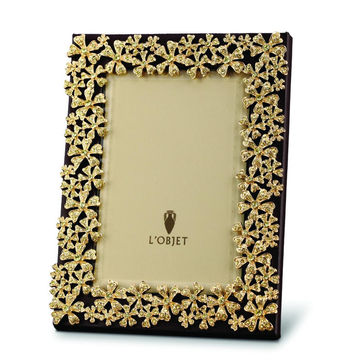 Wie in einem Paradiesgarten, blühen auf dem Bilderrahmen "Garland" von L’Objet himmlische Blumen. Aus dem feinsten italienischen Ledergrund wachsen die 24-karätigen vergoldeten Schmuckblüten mit gelben Swarovski Kristallen oder platinierten Blüten mit weißen Swarovski Kristallen. Mal groß und üppig, mal klein und filigran, aber ihre glitzernden Körper, strahlen immer vor dem dunklen L'Objet Rahmen besonders intensiv.