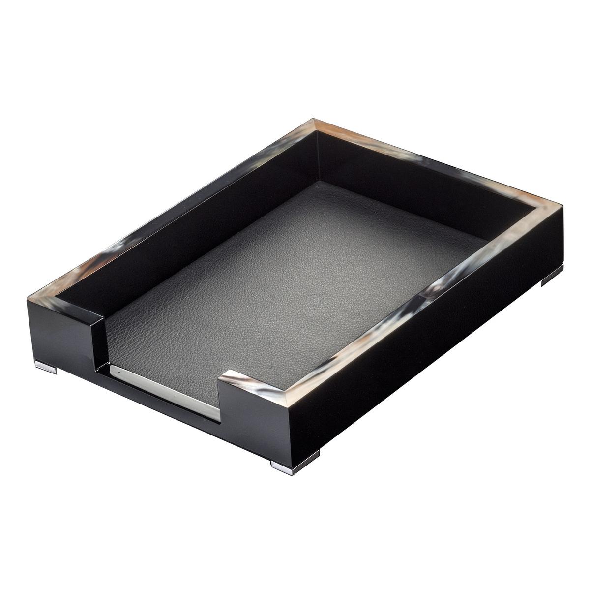 • Dunkles Büffelhorn, schwarzes Leder, schwarzer Lack, verchromte Füße, Handarbeit aus Italien