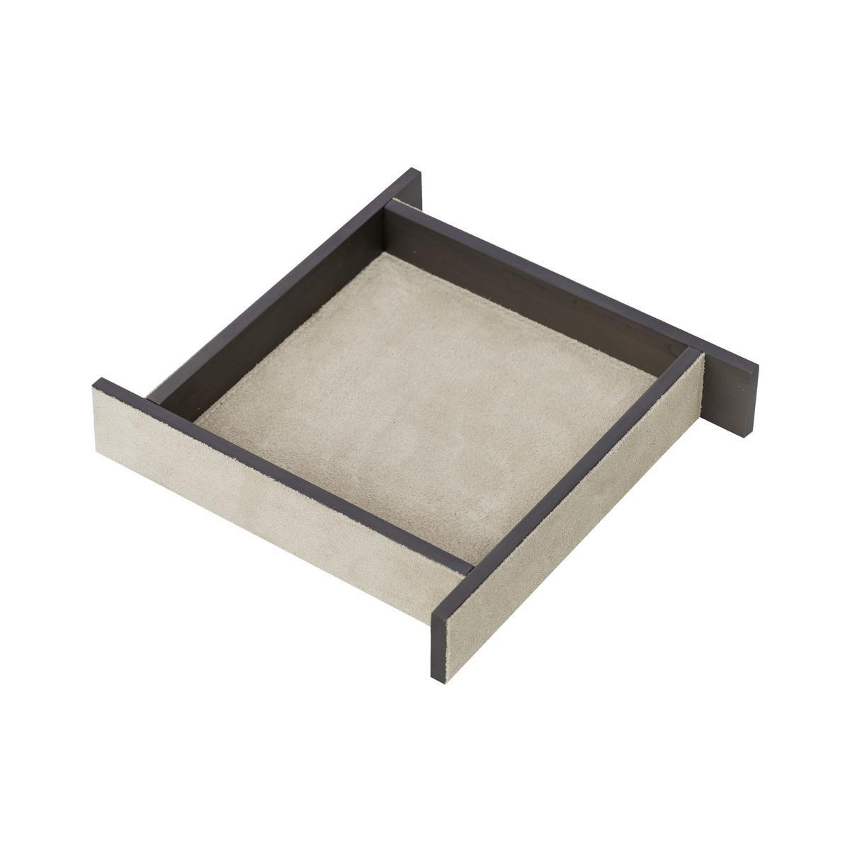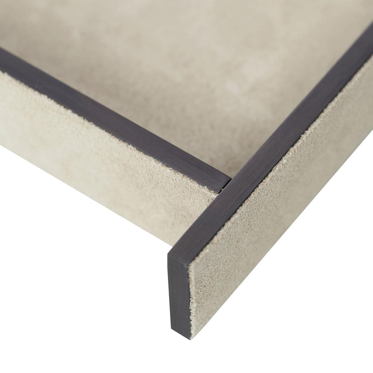 Die Linie "Malaparte" von GioBagnara kombiniert patiniertes Metall und Wildleder. Sie spielt mit den Kontrasten der Materialien, Texturen und Farbtöne. Die streng strukturierte Geometrie erinnert an einen modernistischen Geist von Rietvelds Möbeln und die Geradlinigkeit der japanischen Ästhetik. Hier bieten wir die Büro-Accessoires in Farbe Elfenbein an. Sie sind ebenso in Farbe Schlamm erhältlich.
