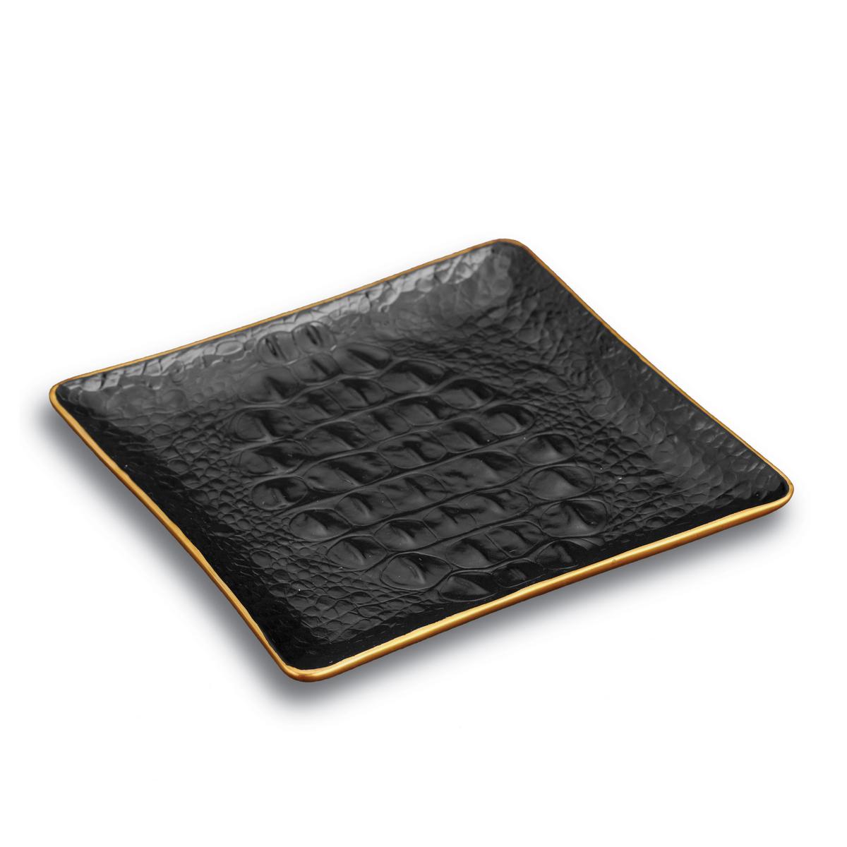 Trotzdem haben die Accessoires von L'Objet die spannende Haptik von grob strukturiertem Krokodilleder: Zacken, Furchen und Noppen kitzeln den Tastsinn so jedes Mal wenn man den Stiftebecher, das Tablett oder die Box benutzt.