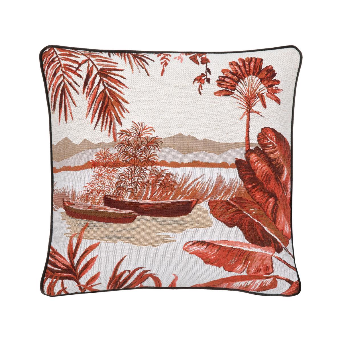 Die Kissenbezüge "Buena Vista" von Iosis wirken wie eine Urlaubspostkarte aus Amazonien. Die dekorativen Kissen bieten eine Aussicht auf Palmen und Fischerboote in subtilen monochromen Nuancen. Beim Anblick der Kissen träumt man sich in Gedanken in den nächsten Sommerurlaub. Sie bestehen aus gewebtem Gobelin-Stoff. Die Rückseite der Bezüge ist unifarben mit dezentem Zick-Zack Muster.