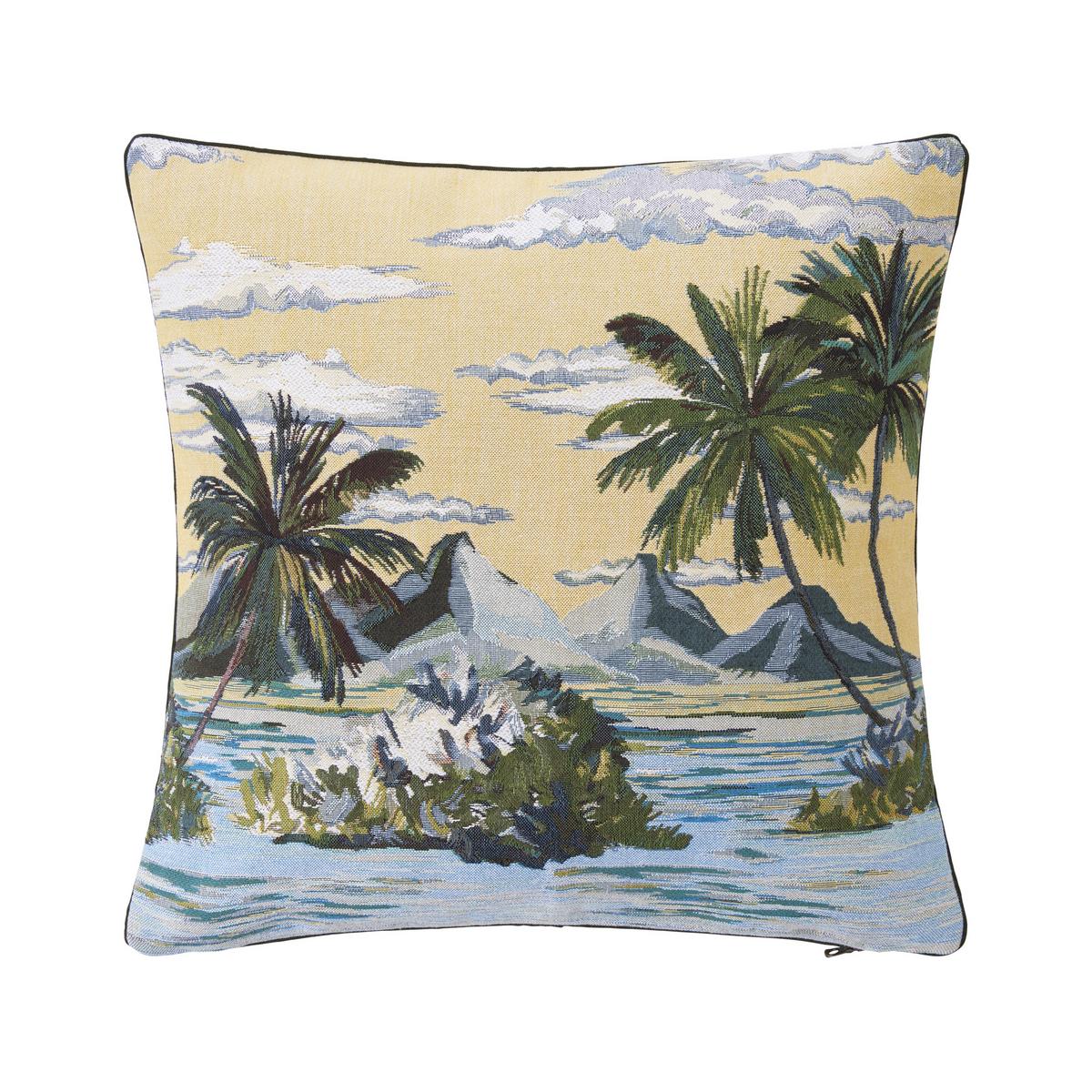 Die Kissenbezüge "Iles Coco" von Iosis wirken wie eine Urlaubspostkarte aus Hawaii. Die dekorativen Kissen bieten eine Aussicht auf Palmen, Berge und Meer. Beim Anblick der Kissen träumt man sich in Gedanken in den nächsten Sommerurlaub. Sie bestehen aus gewebtem Gobelin-Stoff. Die Rückseite der Bezüge ist unifarben mit dezentem Zick-Zack Muster.