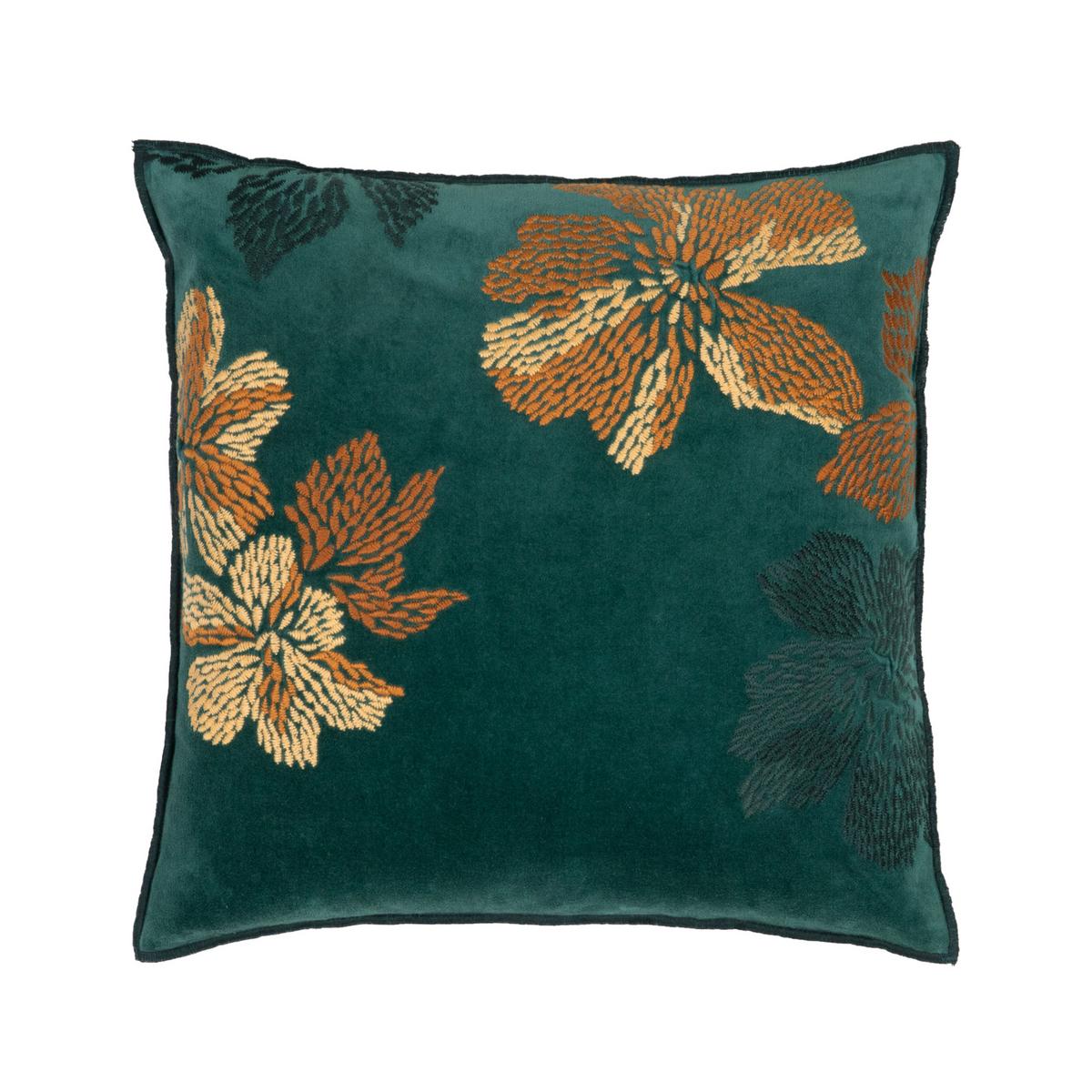 Gestickte Blätter und Blumen treten auf dem feinen Baumwollsamt fast dreidimensional hervor. Das stilisierte Design der Kissen "Merida" von Iosis ist reich an feinen Stickereien und Fadenschattierungen. Eine farblich kontrastreiche Samtpaspelierung vollendet den geschmackvollen Look der Kissen "Merida". Die Rückseite der Bezüge ist unifarben.