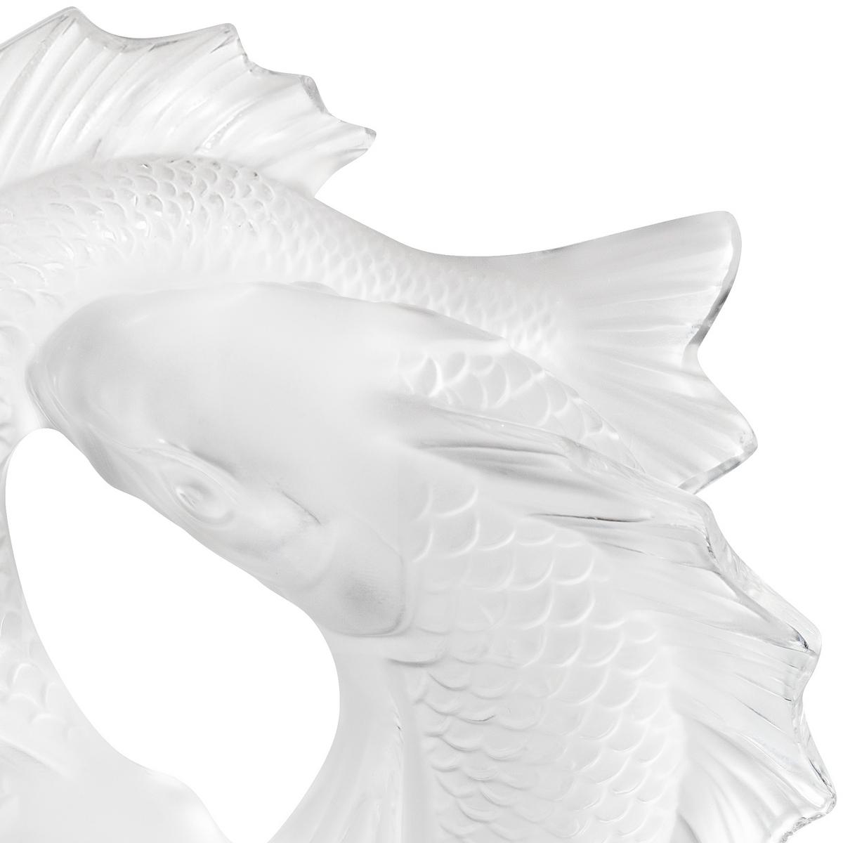 Die Skulptur "Zwei Fische" von Lalique zeigt zwei aus dem Wasser hervorschwimmende Koikarpfen in einer Bewegung, die an Unendlichkeit erinnert. Das satinierte Kristallglas, das Markenzeichen von Lalique, betont die fein geschnitzten Schuppen der Fische.