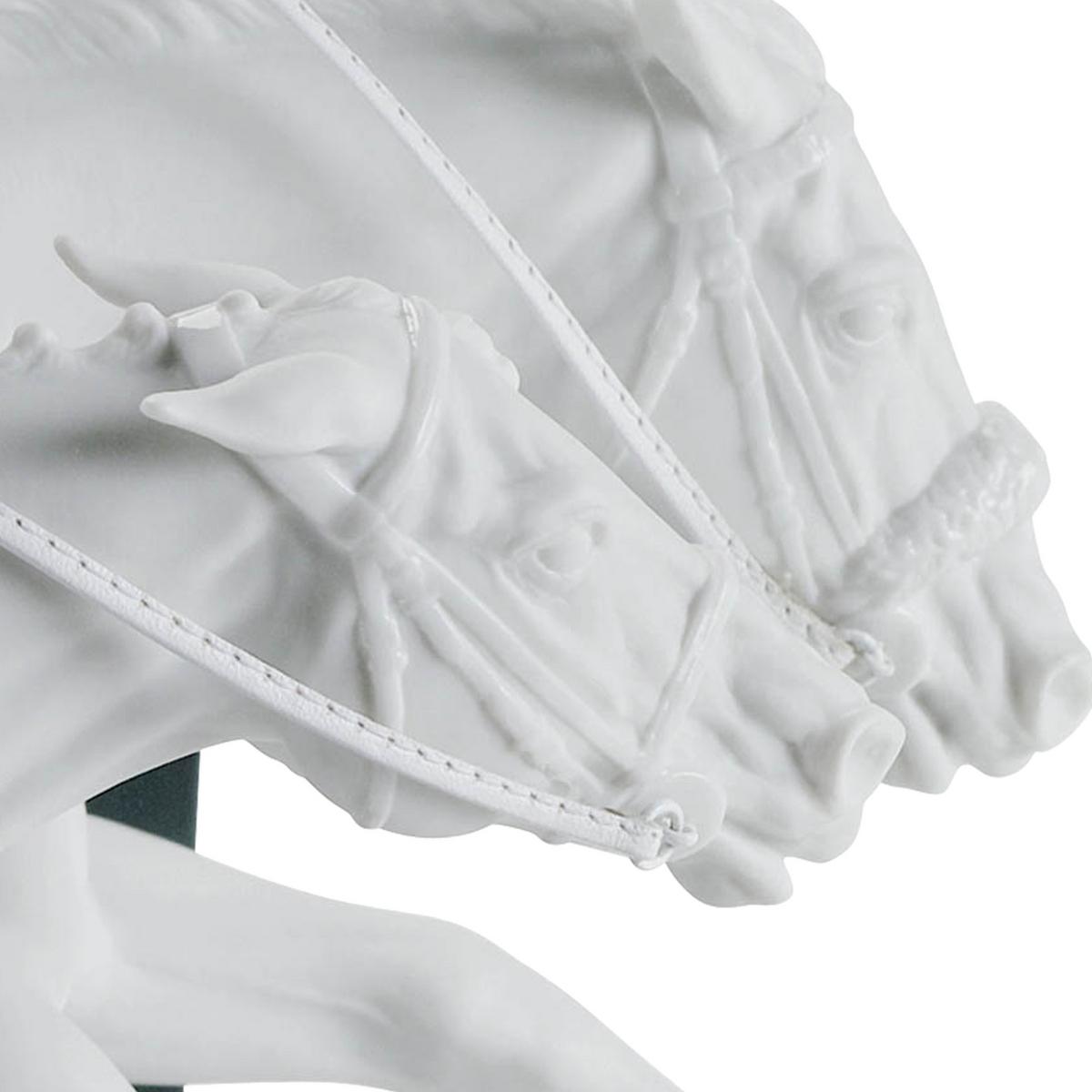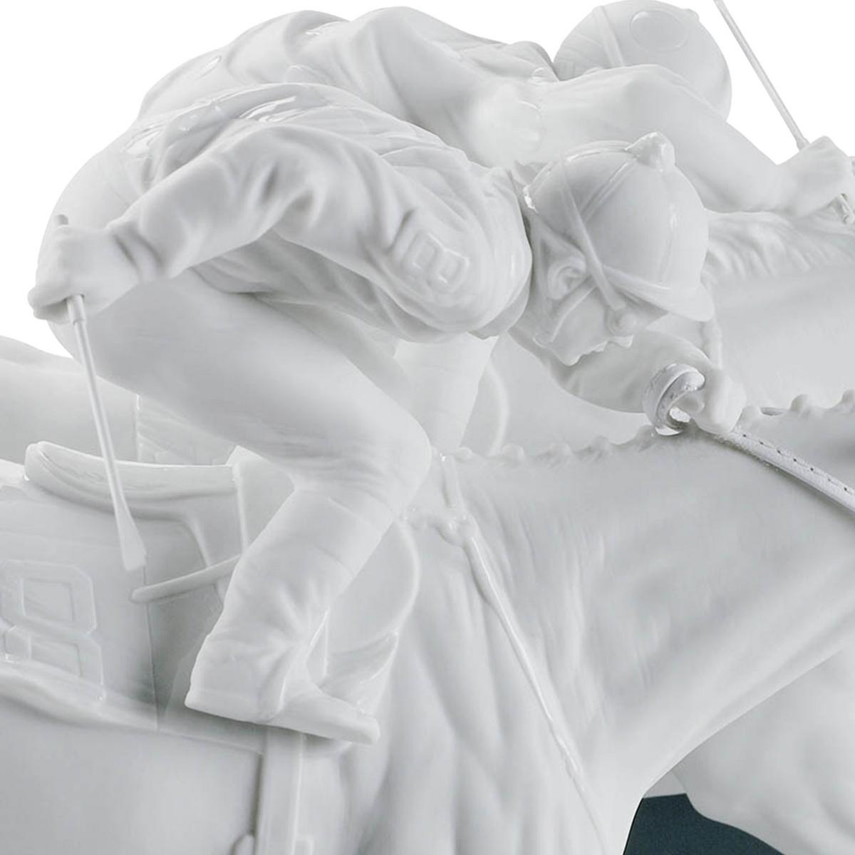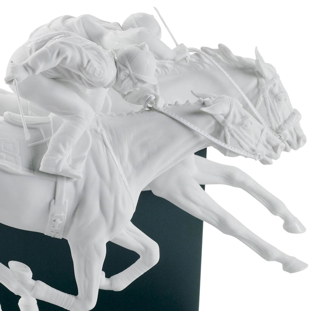Die Skulptur "Horse Race" von Lladró hat bis ins kleinste Detail die mitreisende Energie eines Pferderennens eingefangen. Beide Reiter liefern sich ein Kopf an Kopf rennen, so dass einem beim Betrachten der matt weißen Porzellan Figur fast der Atem stockt. Jedes Detail der Lladró Figur "Horse Race" drückt dabei aber nicht nur in Perfektion die Spannung aus, unter der die Sportler und Pferde stehen - die Details sind nahezu lebensecht: von den Muskeln der Pferde, über die Kleidung der Reiter bis hin zur wehenden Pferdemähne. Solche einzigartigen Kunstwerke aus Porzellan schafft es nur die spanische Manufaktur Lladró zu fertigen.