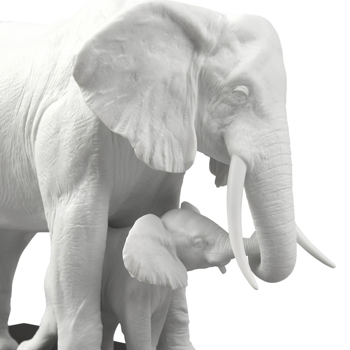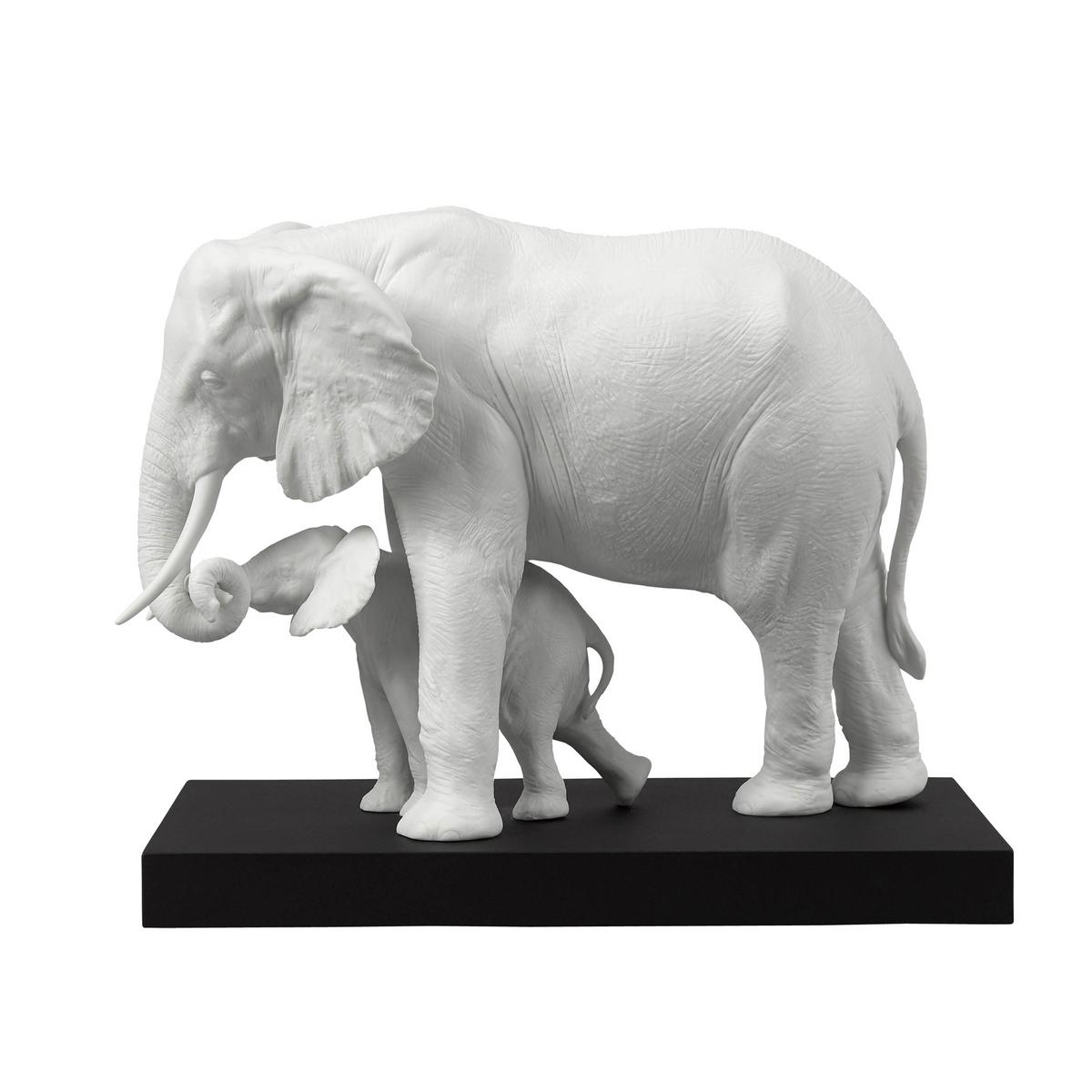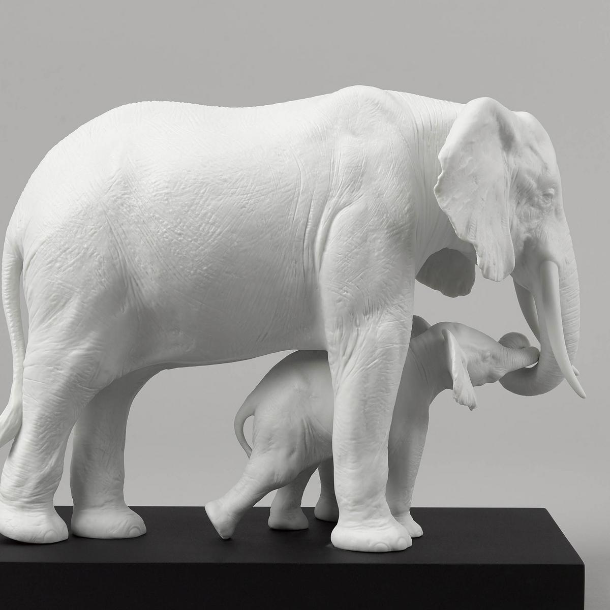 Die Skulptur "Leading the "Way" von Lladró drückt einen besonderen Moment zwischen der Elefantenmutter und ihrem Kind aus. Sanft zeigt die Elefantenmutter ihrem Nachwuchs den Weg und hält ihn fest am Rüssel. Diese liebevolle Geste ist zärtlich und universell. Das matt weiße Porzellan hat eine besonders dekorative Wirkung.