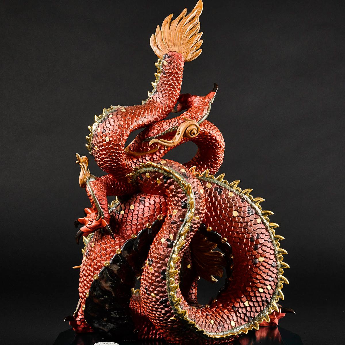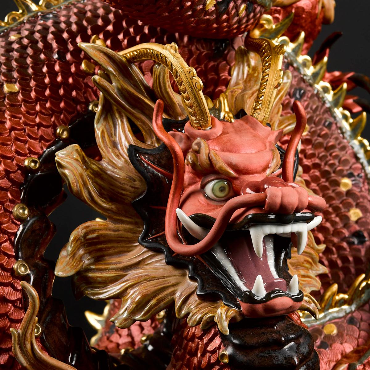 Die intensive rote Farbe der Skulptur "Protective Dragon" wird durch die goldenen Highlights besonders hervorgehoben. Die hunderte von Schuppen der Drachenhaut sind absolut realistisch dargestellt. Jede einzelne Schuppe wird akribisch von Hand bemalt. Die komplexe Skulptur "Protective Dragon" von Lladró hat eine wellenförmige Gestalt in Form der Zahl Acht - der Inbegriff der Glückszahl in der orientalischen Kultur. Die Drachenfigur wird mit passendem Sockel geliefert.