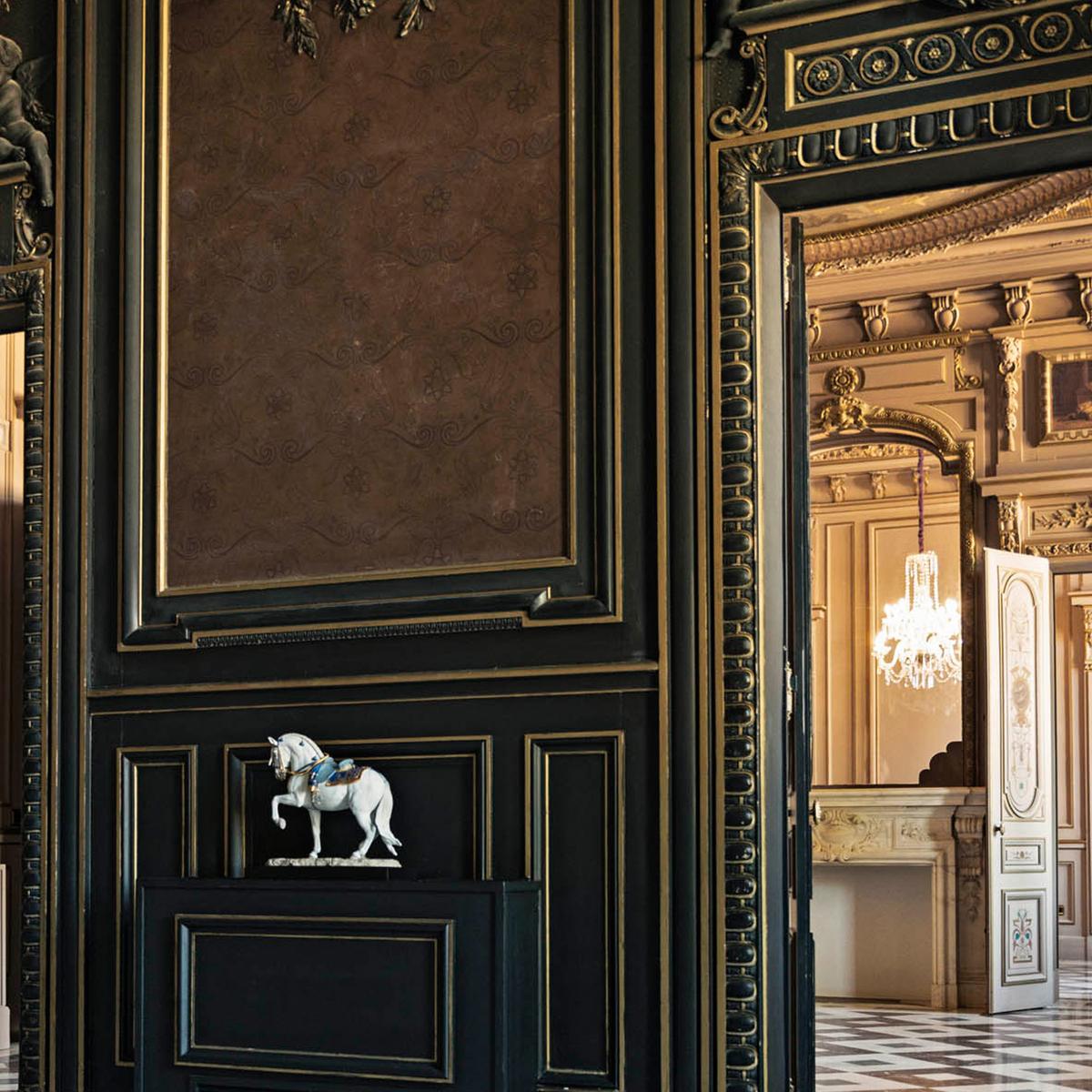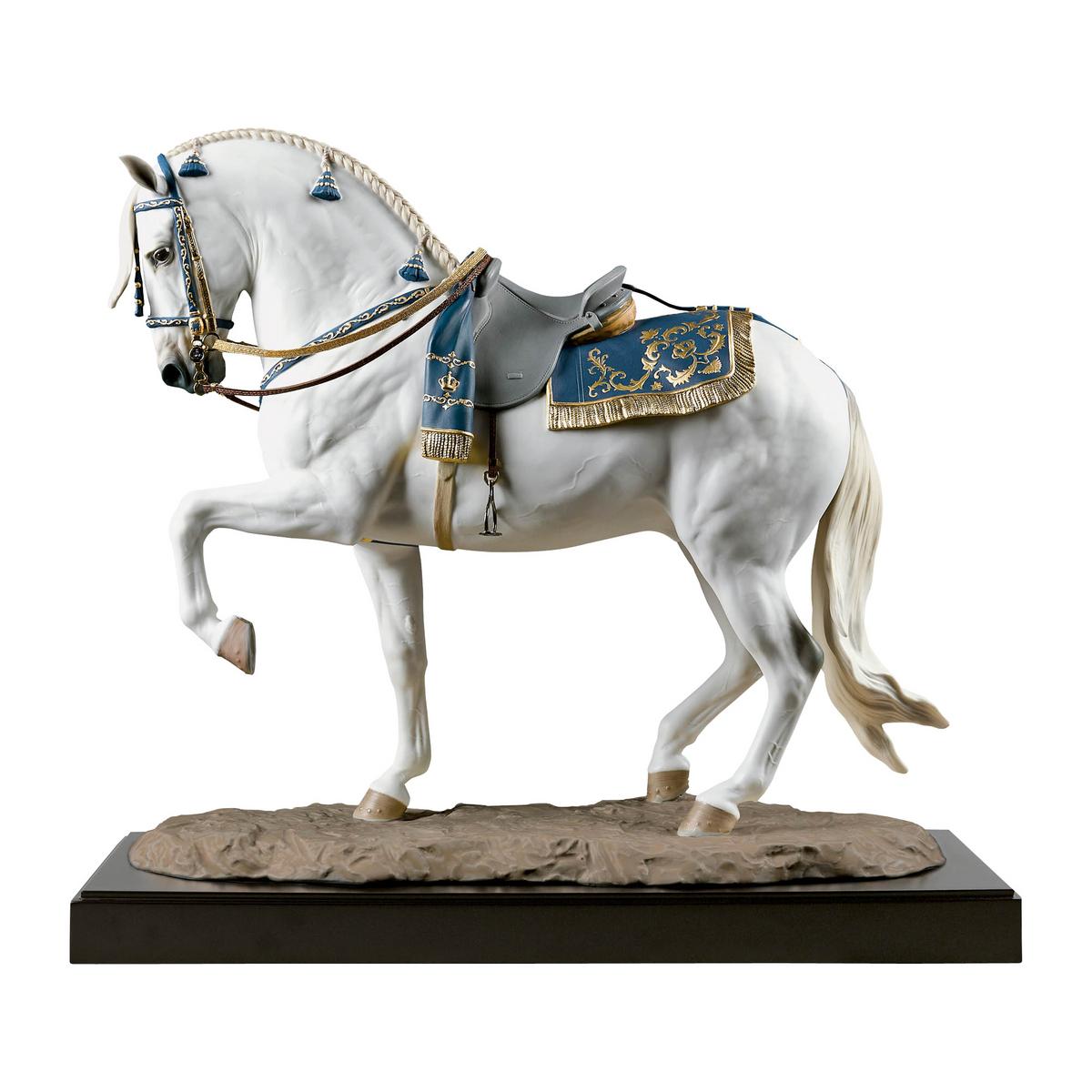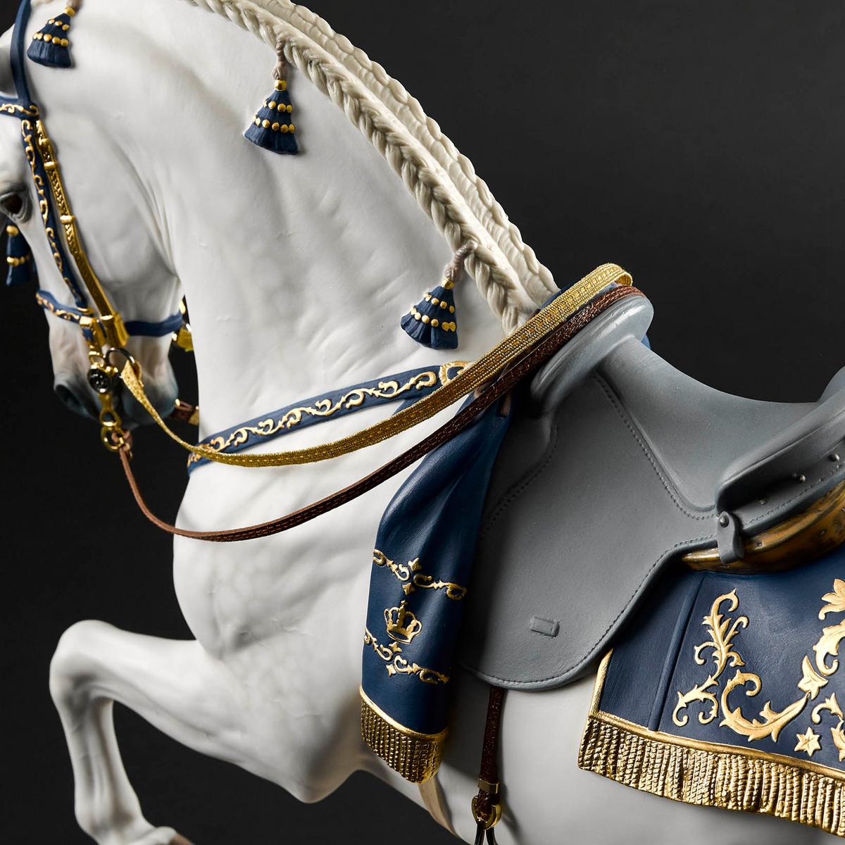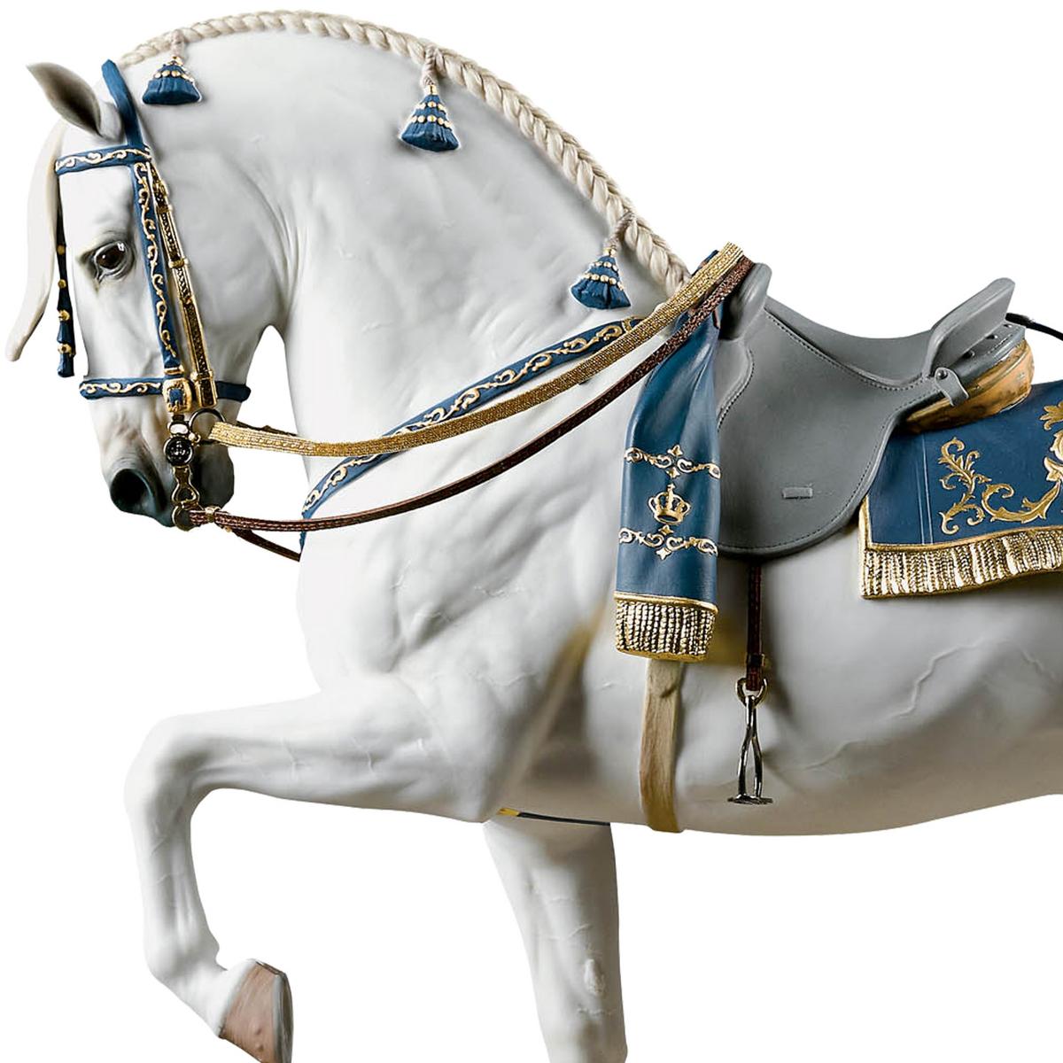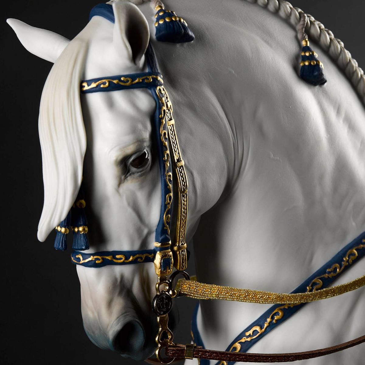 Die Skulptur "Spanish Pure Breed" sieht ihrem lebensechten Vorbild so unwahrscheinlich ähnlich, dass einem der Atem stockt. Die anatomische Präzision und die Dekoration des Pferdes sind besonders beeindruckend. Das Kopfstück, der Sattel und die Satteldecke kombinieren ein intensives Blau mit Gold. Das Halfter und die Steigbügel bestehen aus vergoldetem Messing und Naturleder. Solche einzigartigen Kunstwerke aus Porzellan schafft es nur die spanische Manufaktur Lladró zu fertigen.