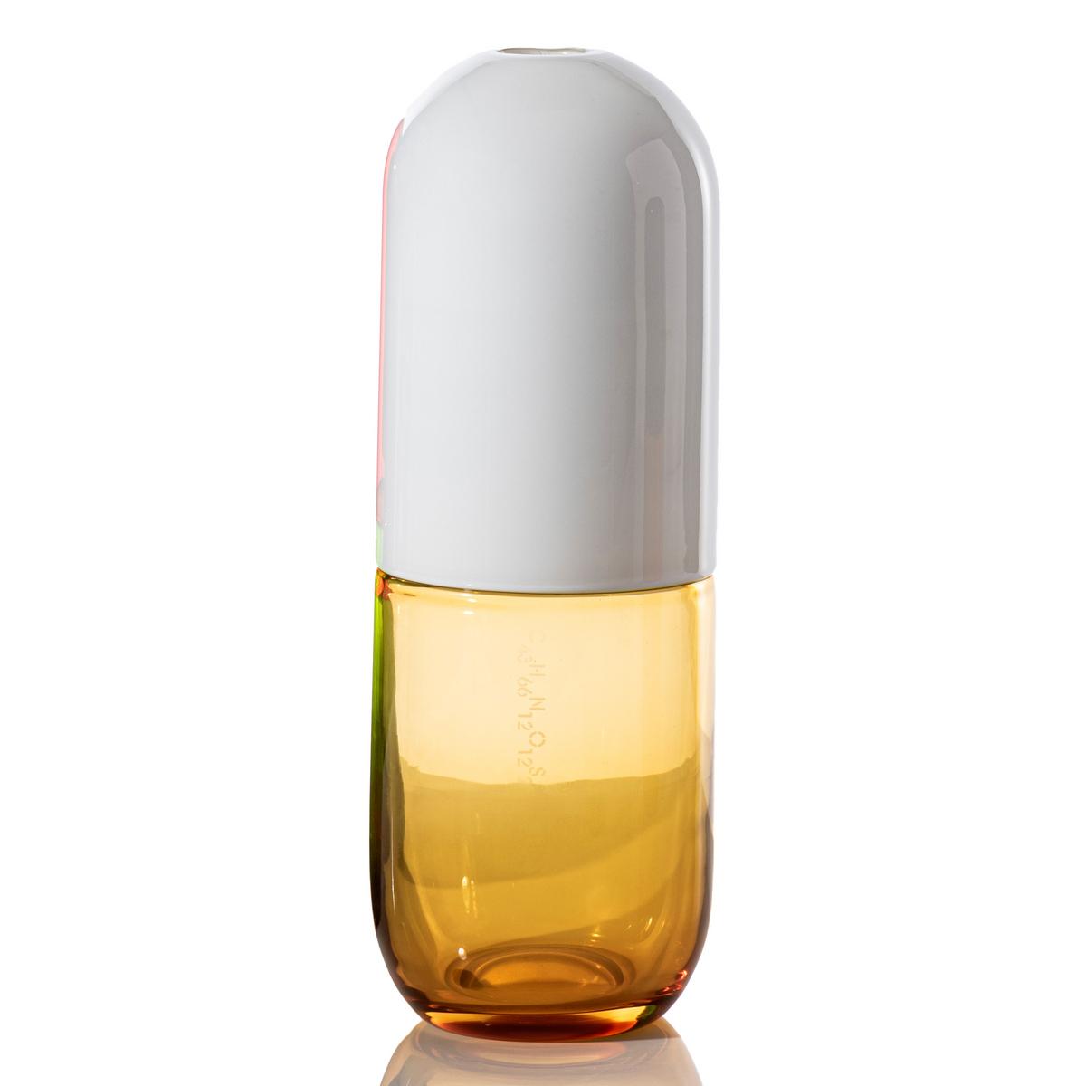 Die mundgeblasenen Venini Glasobjekte sind mehr Kunstobjekte, aber durchaus auch als Vase zu verwenden. Form und Farbe erinnern an "Glückspillen" aus der Pharmaindustrie. Fabio Novembre wollte mit einem Augenzwinkern zum Ausdruck bringen, dass spielerisches Design genau den gleichen Effekt besitzen kann wie echte Pillen. Entstanden sind fünf verschiedene Farbkombination in leuchtenden Farben aus Muranoglas. Die chemische Formel für jedes Glücks-Hormon ist dezent auf jede Vase eingraviert.