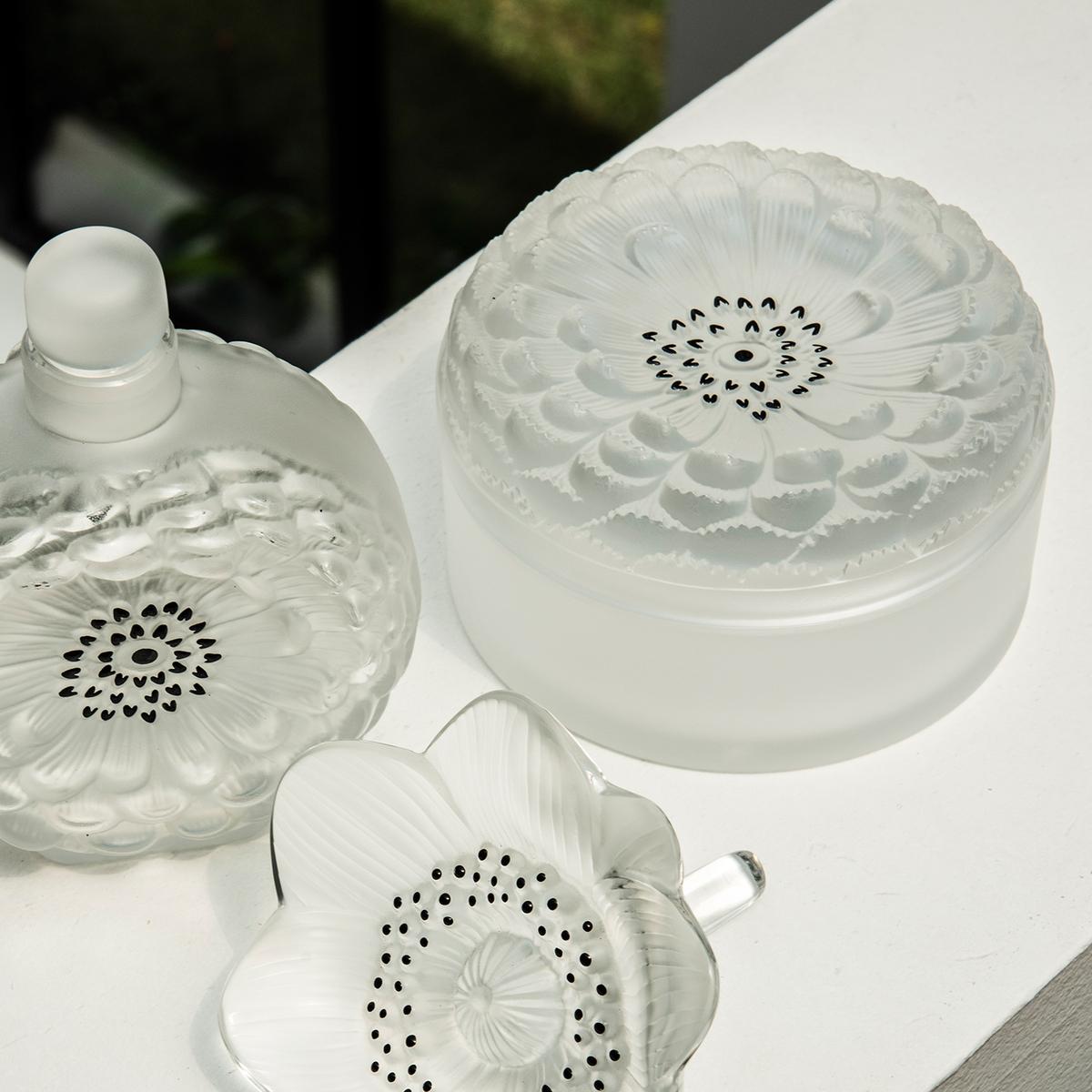 Die Box "Dahlia" von Lalique ist nicht nur ein elegantes Deko-Objekt für das Schlafzimmer oder im Bad, sie ist auch vielseitig einsetzbar z.B. als Aufbewahrungsort für wertvolle Schätze wie Schmuck. Der Deckel der Lalique Box ist echten Dahlien Blumen nachempfunden. Die feinen Blütenblätter treten richtig dreidimensional hervor und können sogar ertastet werden. Das satinierte Kristallglas wirkt besonders edel.