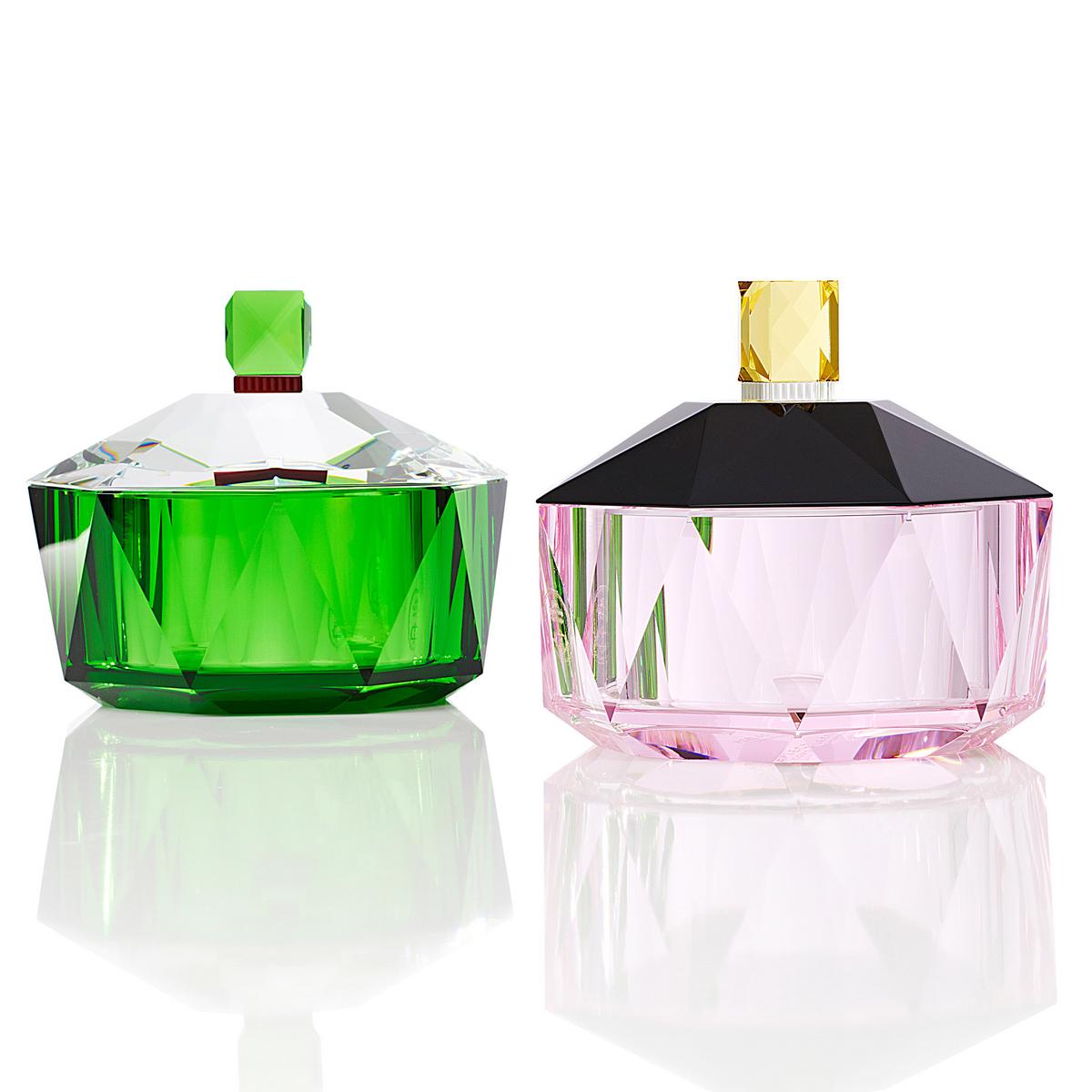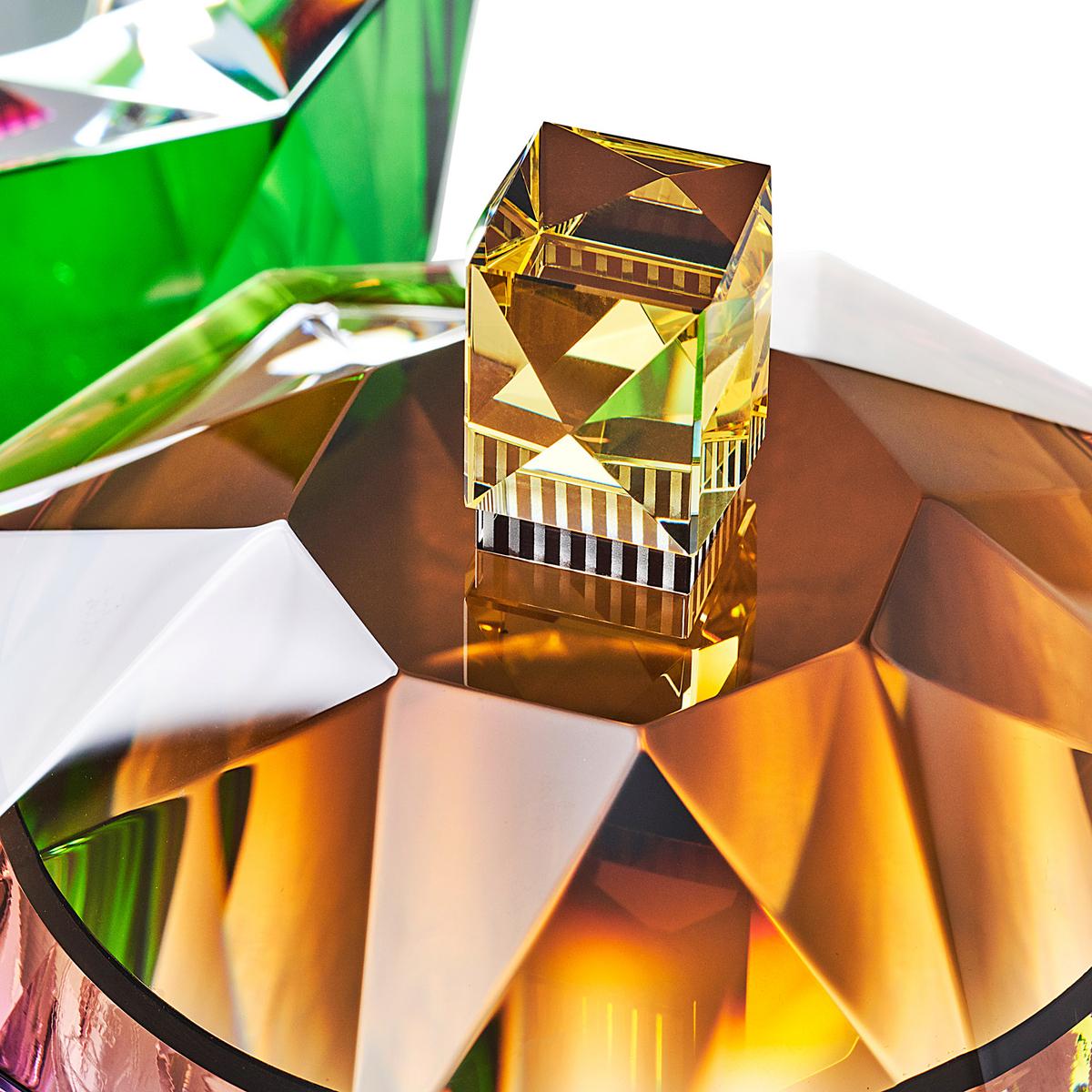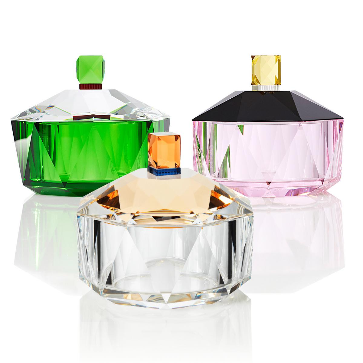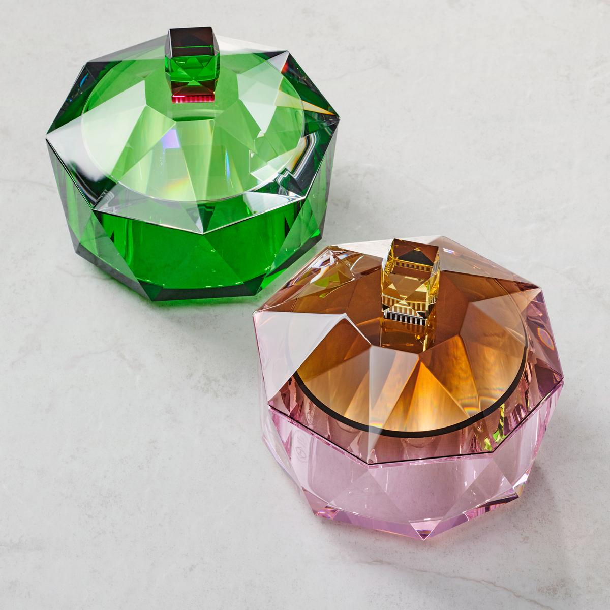 Opulente Farben, avantgardistische Linien – Die Dosen "New Haven" von Reflections Copenhagen fordern die Stile und Silhouetten der aktuellen Wohnkultur heraus. Die schweren Dosen aus handgeschliffenem Kristallglas sind mit Deckel 12 cm hoch und haben einen Umfang von 13 cm. Sie sind außen achteckig und innen zylindrisch geformt. Ihre einzigartige Farbgestaltung verströmt zeitgenössischen Glamour.