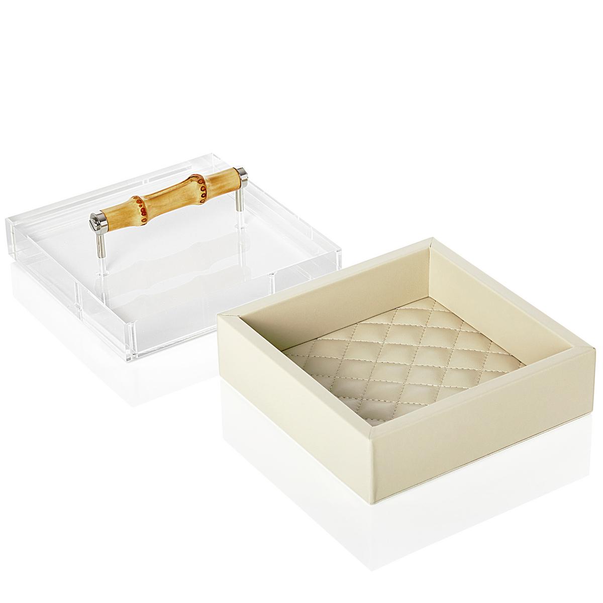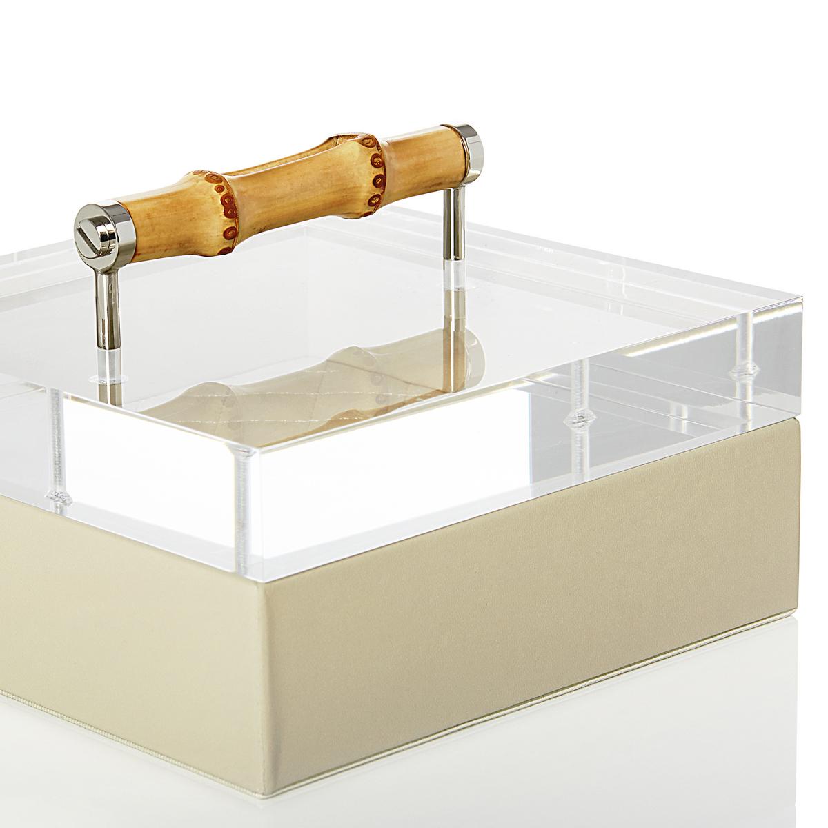 Die Box besteht aus elfenbeinfarbenem Nappaleder. Die Innenseite wurde mit gestepptem und wattiertem Nappaleder ausgeschlagen. Den Deckel aus hochwertigem Acrylglas ziert ein Bambusgriff.