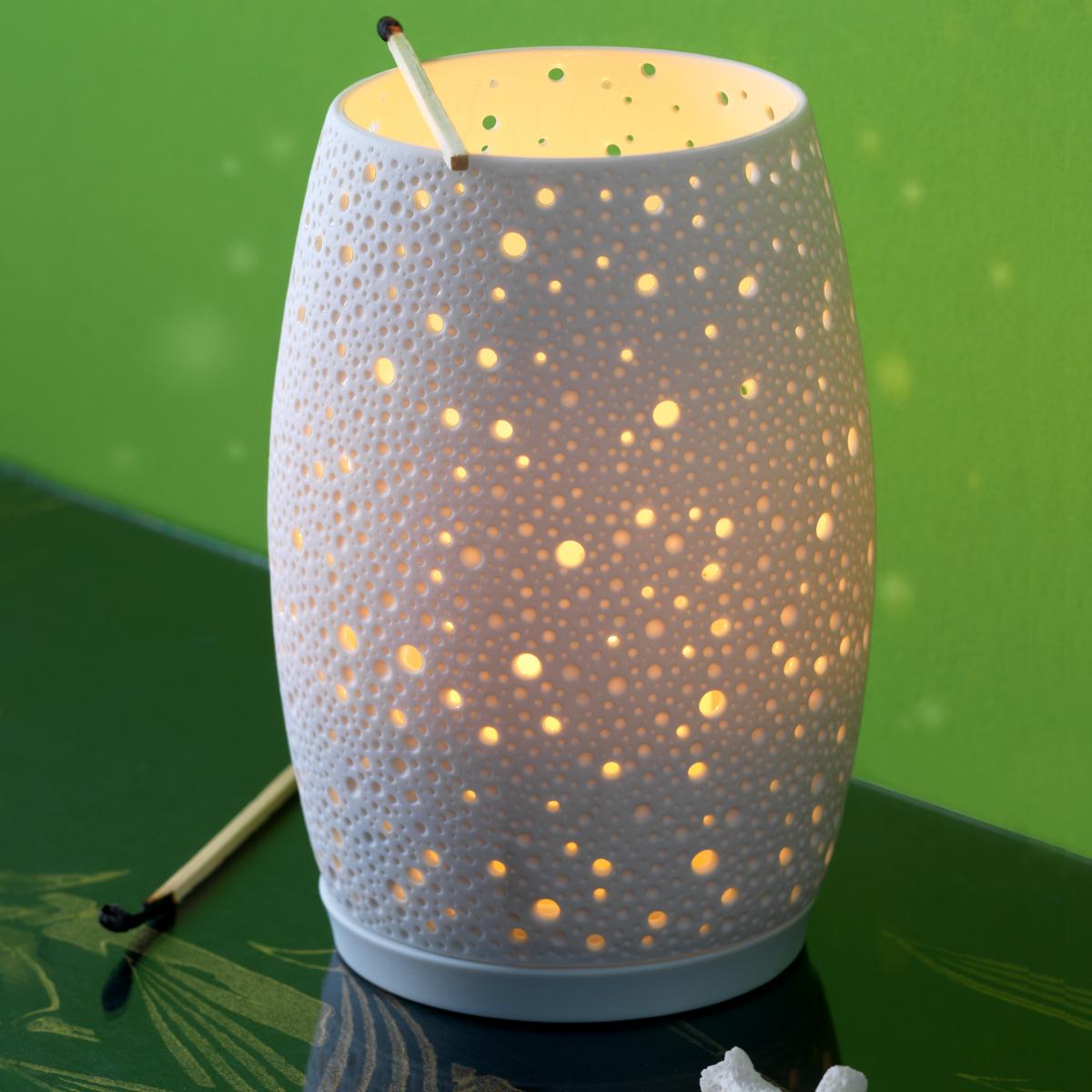 Größtes handwerkliches Geschick erfordert die Herstellung dieser hauchdünnen Vasen und des fast transparenten Windlichtes aus Biskuit-Porzellan. Die bauchigen Zylinder perforierte der Designer Ted Muehling mit zahllosen kleinen Löchern mit dem Effekt, dass der Kerzenschein in unterschiedlicher Intensität heraustritt. Von der Sonne ausgeblichene Korallenstücke gaben dem Künstler die Idee zu diesen ausgefallenen Designobjekten, die er für die Nymphenburger Porzellanmanufaktur entwarf. (teilweise Fotografien von Don Freeman). Weitere Accessoires im Korallen-Design finden Sie unten.