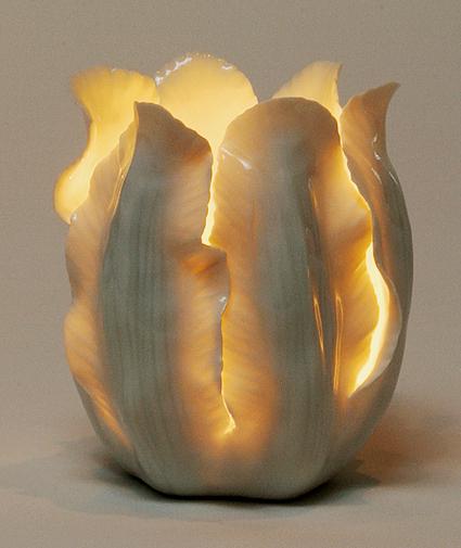 Europas dünnstes Porzellan wird in Nymphenburg hergestellt. Diese Kunstfertigkeit machte sich der New Yorker Designer Ted Muehling zu Nutzen, der für das traditionsreiche Unternehmen eine exquisite Kollektion entwarf. Sein Tulpenwindlicht ist zart wie ein Papierlampion, wofür ein spezielles Produktionsverfahren und großes handwerkliches Können verantwortlich sind. Die Schwierigkeit liegt darin, die ungebrannte Porzellanmasse nach einer sehr kurzen Antrocknungszeit aus der Arbeitsform zu lösen. Denn an der Wand der Form darf sich lediglich ein Porzellanfilm bilden. Nur so ist gewährleistet, dass das spätere Windlicht besonders dünnwandig ist. (Fotografien von Don Freeman).