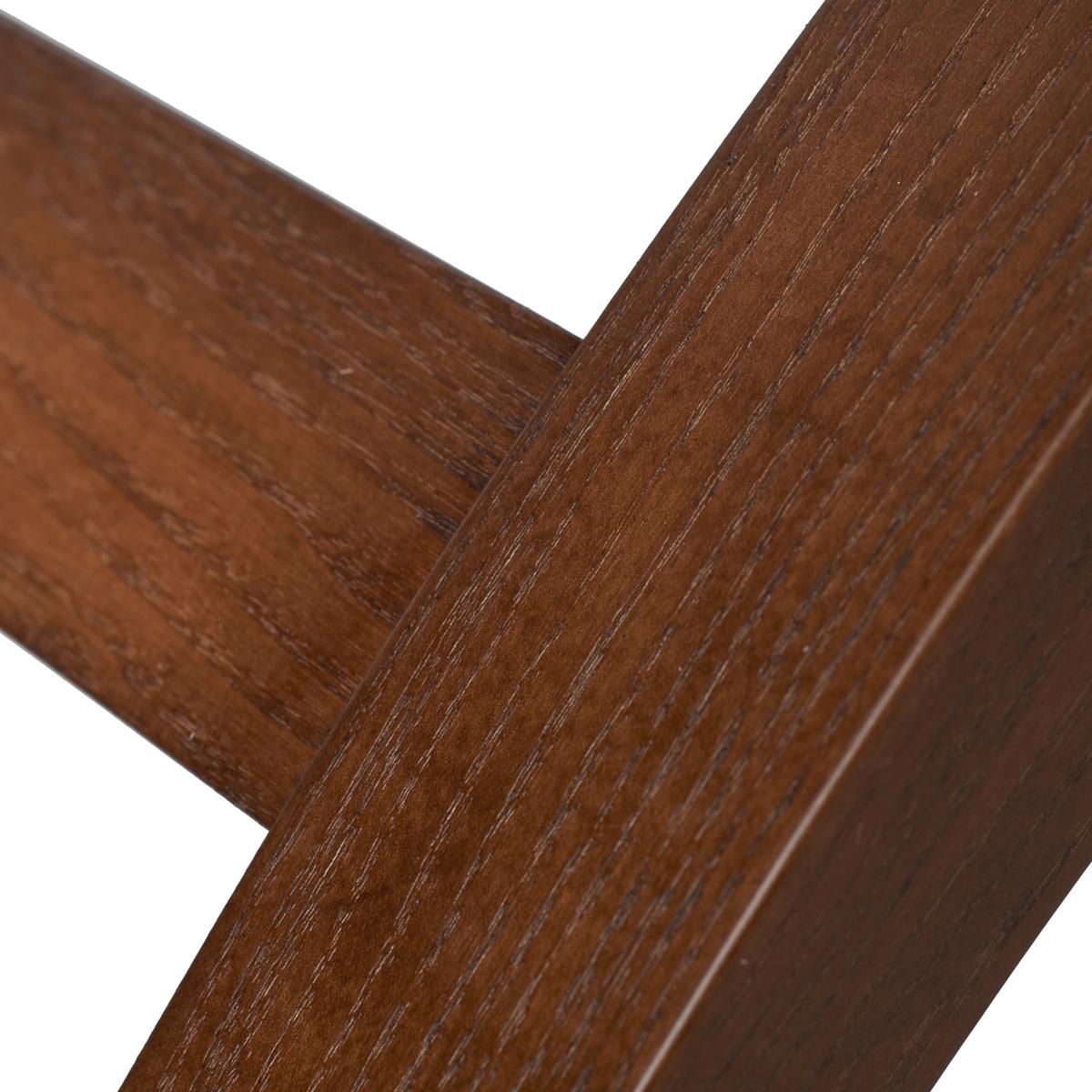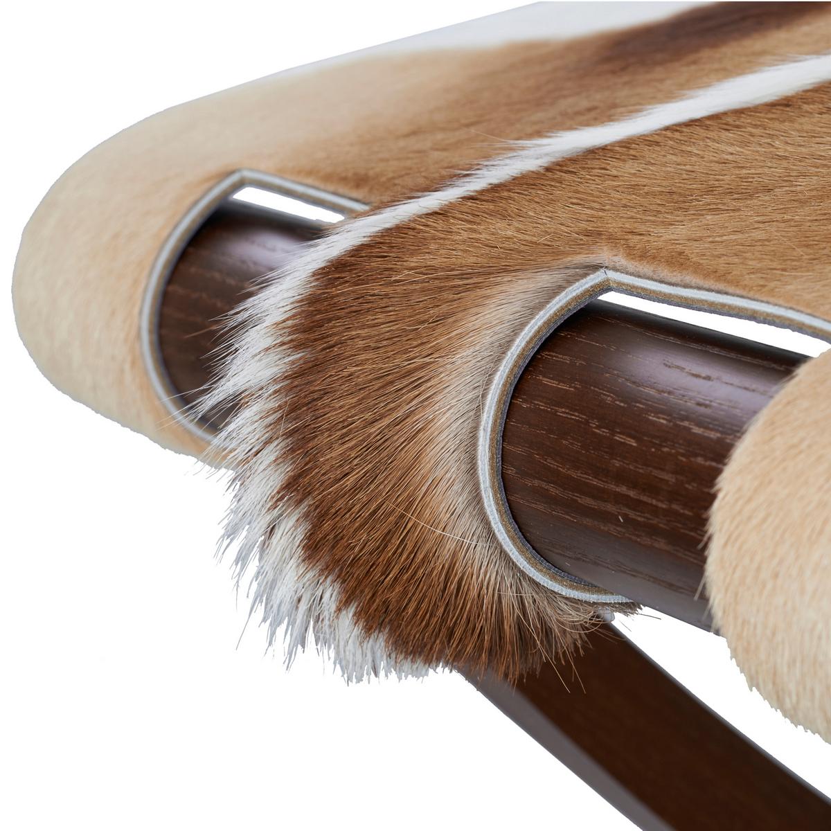 Das Gestell besteht aus dunklem Nussbaumholz und der Lederbezug aus Springbockleder. Da Springbockleder ein Naturprodukt ist, besitzt jeder Kofferständer einen individuellen Lederbezug.