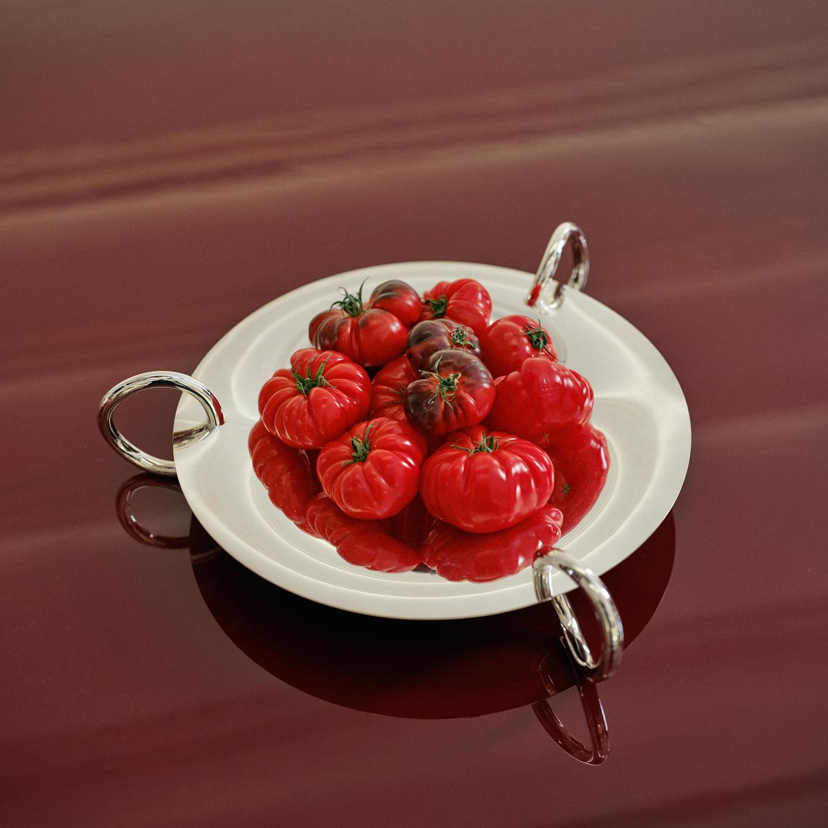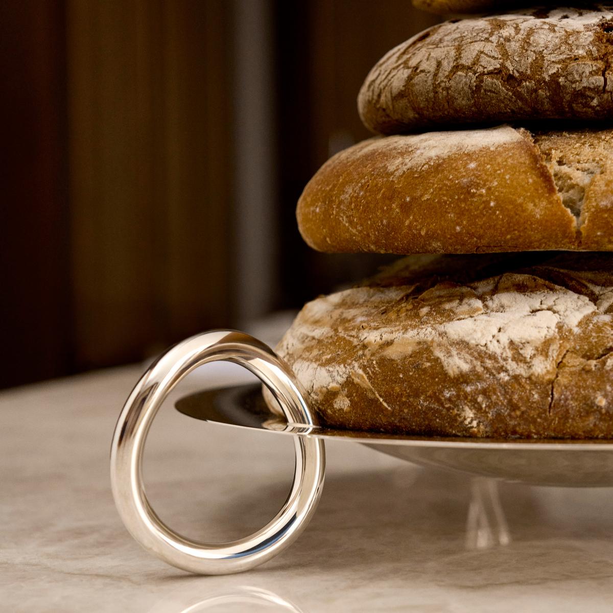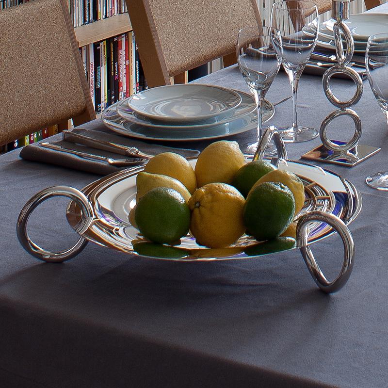 Die große Schale "Vertigo" glänzt mit raffiniertem Design in schlichter Eleganz. Der Clou des versilberten Glanzstücks sind seine Füße: dynamisch geschwungene Ringe, die sich als Leitmotiv durch die gesamte Kollektion "Vertigo" ziehen, die die französische Star-Designerin Andrée Putman für Christofle entwarf.