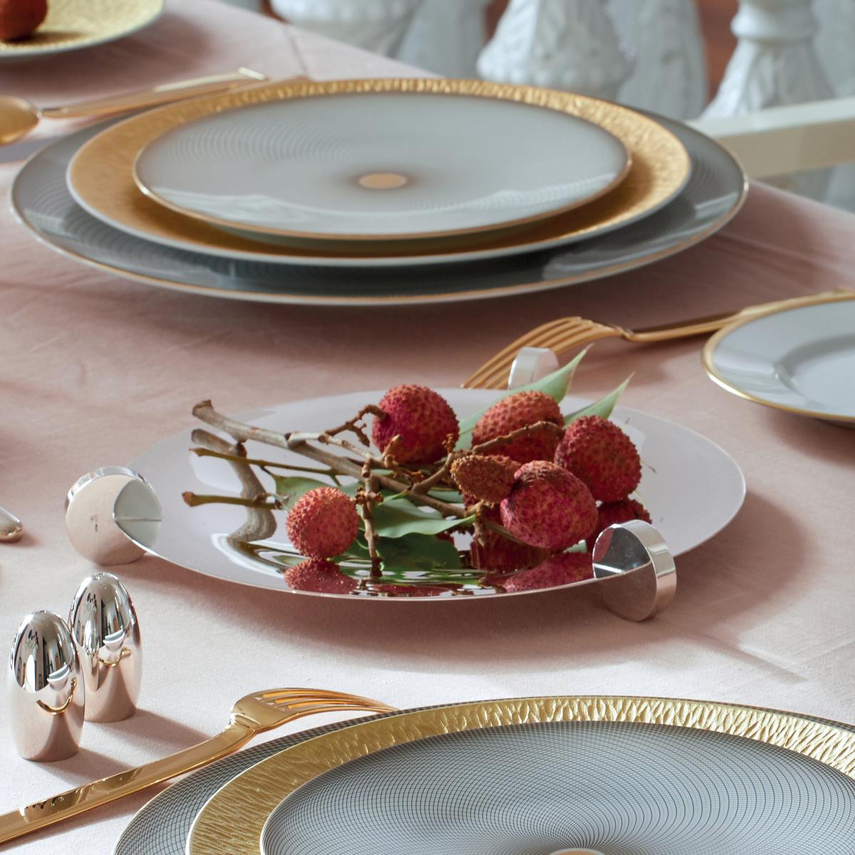 Die flache, versilberte Schale "Galet" von Ercuis ist ein wunderschöner Blickfang. Die kreisförmigen Füßchen sind den Formen von Kieselsteinen nachempfunden. Daher auch der Name: "Galet“ heißt Kieselstein auf Französisch.