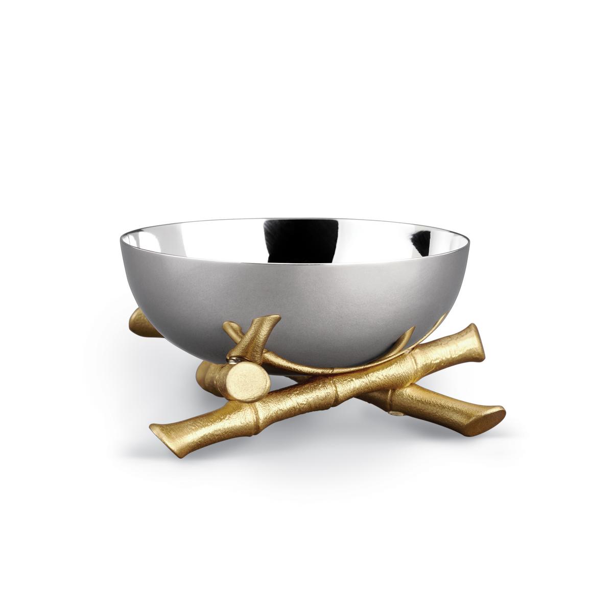 Selten spielen Gold und Edelstahl so gut zusammen, wie in diesem Entwurf von L’Objet: Die Schalen "Bambou" aus poliertem Edelstahl, ruhen auf 24-karätig vergoldeten Bambusstäben. Deren faszinierende Naturformen und ihr strahlend gelbes Gold, werden in dem silbernen Bauch der Schalen "Bambou" von L’Objet reflektiert.