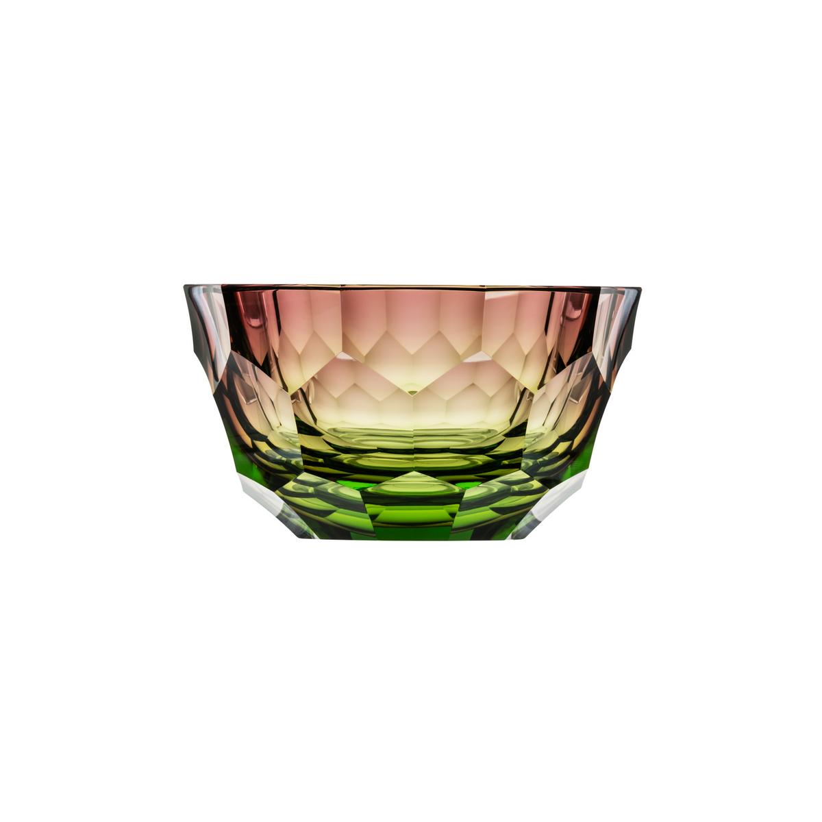 Der kantige und sechseckige Schliff sorgt für einen dreidimensionalen optischen Effekt der seines gleichen sucht. Das Zusammenspiel aus leichten Rosétönen hin zu einem Ozeangrün ist faszinierend und sehr harmonisch. Die Farben wirken beim Drehen und Wenden mal intensiv, mal hauchzart – ein besonderes Farbenspiel, welches nur Moser so einmalig beherrscht.