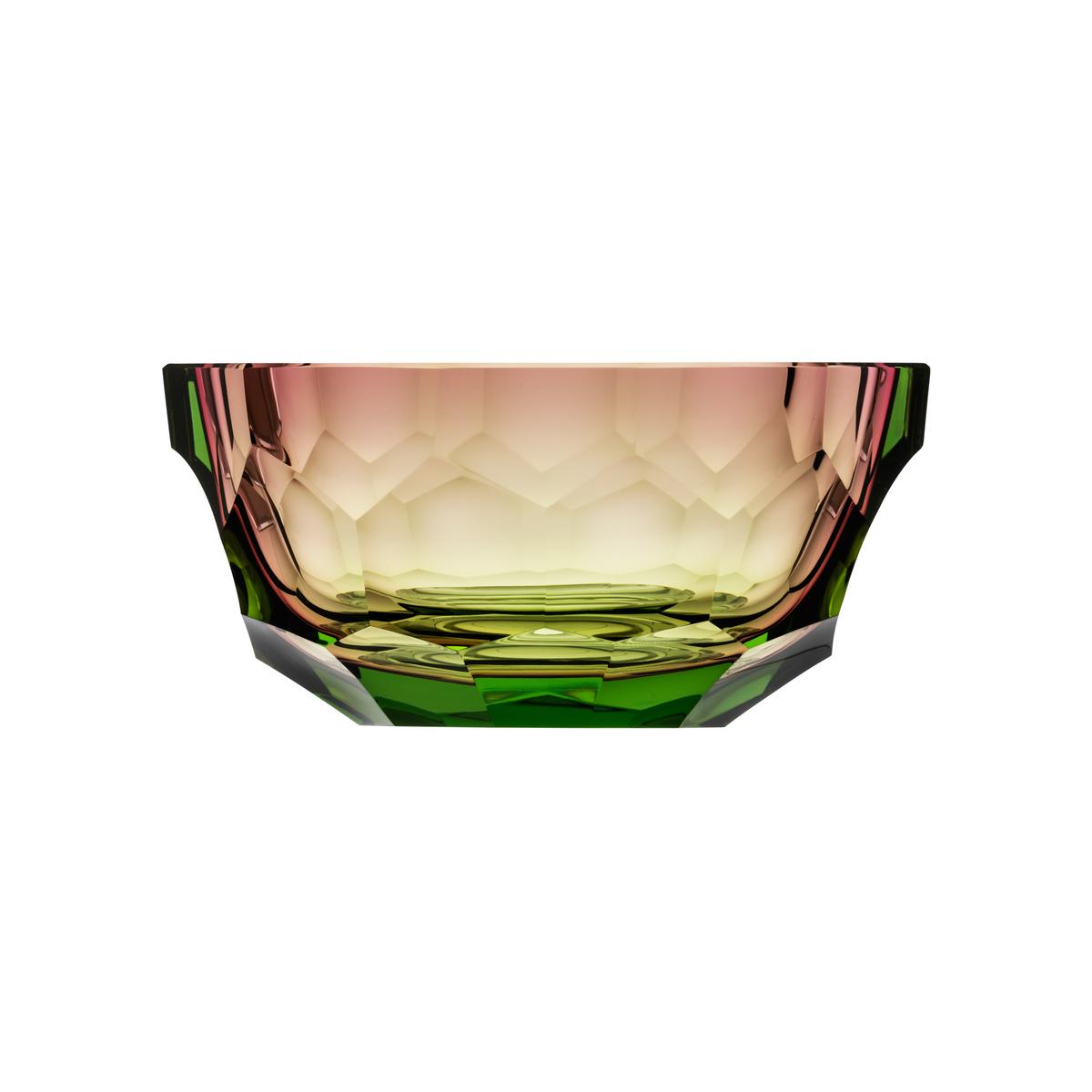 Der kantige und sechseckige Schliff sorgt für einen dreidimensionalen optischen Effekt der seines gleichen sucht. Das Zusammenspiel aus leichten Rosétönen hin zu einem Ozeangrün ist faszinierend und sehr harmonisch. Die Farben wirken beim Drehen und Wenden mal intensiv, mal hauchzart – ein besonderes Farbenspiel, welches nur Moser so einmalig beherrscht.